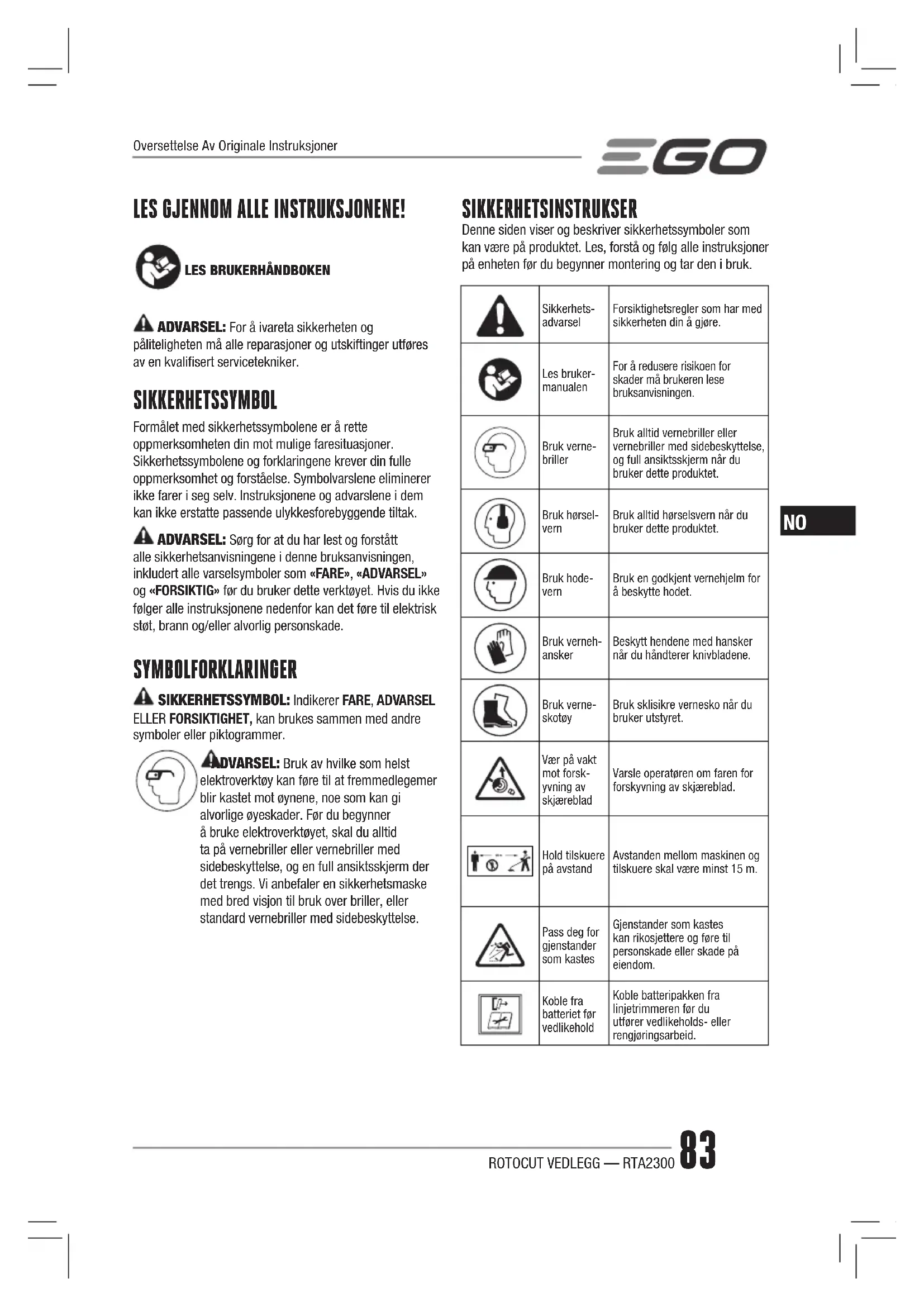 ADVARSEL: For å ivareta sikkerheten og påliteligheten må alle reparasjoner og utskiftinger utføres av en kvalisert servicetekniker. SIKKERHETSSYMBOL Formålet med sikkerhetssymbolene er å rette oppmerksomheten din mot mulige faresituasjoner. Sikkerhetssymbolene og forklaringene krever din fulle oppmerksomhet og forståelse. Symbolvarslene eliminerer ikke farer i seg selv. Instruksjonene og advarslene i dem kan ikke erstatte passende ulykkesforebyggende tiltak. ADVARSEL: Sørg for at du har lest og forstått alle sikkerhetsanvisningene i denne bruksanvisningen, inkludert alle varselsymboler som «FARE», «ADVARSEL» og «FORSIKTIG» før du bruker dette verktøyet. Hvis du ikke følger alle instruksjonene nedenfor kan det føre til elektrisk støt, brann og/eller alvorlig personskade. SYMBOLFORKLARINGER SIKKERHETSSYMBOL: Indikerer FARE, ADVARSEL ELLER FORSIKTIGHET, kan brukes sammen med andre symboler eller piktogrammer. ADVARSEL: Bruk av hvilke som helst elektroverktøy kan føre til at fremmedlegemer blir kastet mot øynene, noe som kan gi alvorlige øyeskader. Før du begynner å bruke elektroverktøyet, skal du alltid ta på vernebriller eller vernebriller med sidebeskyttelse, og en full ansiktsskjerm der det trengs. Vi anbefaler en sikkerhetsmaske med bred visjon til bruk over briller, eller standard vernebriller med sidebeskyttelse. SIKKERHETSINSTRUKSER Denne siden viser og beskriver sikkerhetssymboler som kan være på produktet. Les, forstå og følg alle instruksjoner på enheten før du begynner montering og tar den i bruk. Sikkerhets-advarselForsiktighetsregler som har med sikkerheten din å gjøre.Les bruker-manualenFor å redusere risikoen for skader må brukeren lese bruksanvisningen.Bruk verne-brillerBruk alltid vernebriller eller vernebriller med sidebeskyttelse, og full ansiktsskjerm når du bruker dette produktet.Bruk hørsel- vern Bruk alltid hørselsvern når du bruker dette produktet.Bruk hode- vern Bruk en godkjent vernehjelm for å beskytte hodet.Bruk verneh-anskerBeskytt hendene med hansker når du håndterer knivbladene.Bruk verne-skotøyBruk sklisikre vernesko når du bruker utstyret.Vær på vakt mot forsk-yvning av skjærebladVarsle operatøren om faren for forskyvning av skjæreblad.Hold tilskuere på avstandAvstanden mellom maskinen og tilskuere skal være minst 15 m.Pass deg for gjenstander som kastesGjenstander som kastes kan rikosjettere og føre til personskade eller skade på eiendom.Koble fra batteriet før vedlikeholdKoble batteripakken fra linjetrimmeren før du utfører vedlikeholds- eller rengjøringsarbeid. Oversettelse Av Originale InstruksjonerROTOCUT VEDLEGG — RTA230084
