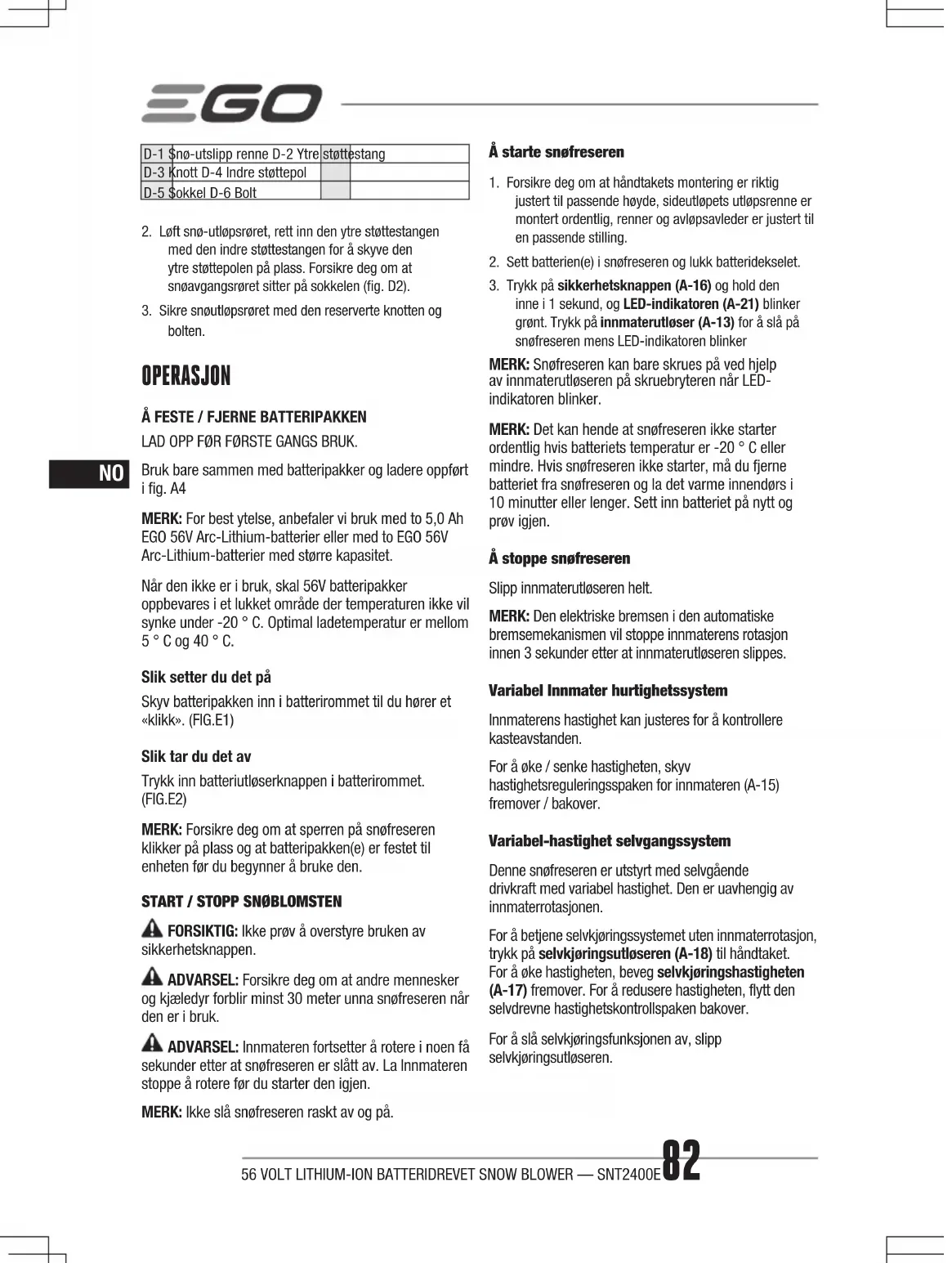 LAD OPP FØR FØRSTE GANGS BRUK. Bruk bare sammen med batteripakker og ladere oppført i fig. A4 MERK: For best ytelse, anbefaler vi bruk med to 5,0 Ah EGO 56V Arc-Lithium-batterier eller med to EGO 56V Arc-Lithium-batterier med større kapasitet. Når den ikke er i bruk, skal 56V batteripakker oppbevares i et lukket område der temperaturen ikke vil synke under -20 ° C. Optimal ladetemperatur er mellom 5 ° C og 40 ° C. Slik setter du det på Skyv batteripakken inn i batterirommet til du hører et «klikk». (FIG.E1) Slik tar du det av Trykk inn batteriutløserknappen i batterirommet. (FIG.E2) MERK: Forsikre deg om at sperren på snøfreseren klikker på plass og at batteripakken(e) er festet til enheten før du begynner å bruke den.