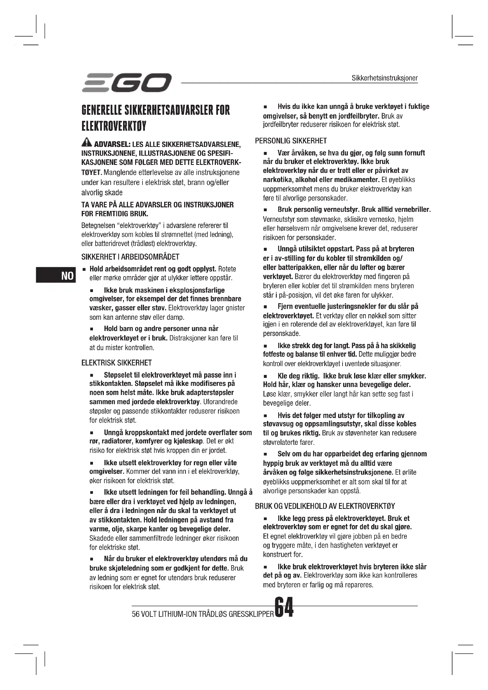 KLIPPER FARE: Denne maskinen ble bygget for å brukes i henhold til reglene for sikker drift som nnes i denne bruksanvisningen. Som med alle typer elektroutstyr, kan uforsiktighet eller feil fra operatørens side føre til alvorlig skade. Denne maskinen er i stand til å skade hender og føtter, og kaste ut gjenstander. Å ikke følge sikkerhetsinstruksene til fulle kan resultere i alvorlige skader eller død. ADVARSEL: Når du bruker trådløse gressklippere, må du alltid følge grunnleggende sikkerhetsregler for å redusere risikoen for brann, elektrisk støt og personskade.VIKTIGLES NØYE FØR BRUK. BEHOLD FOR SENERE BRUK.SIKKERHETSREGLER FOR TRÅDLØSE GRESSKLIPPERE:FORSIKTIG – IKKE RØR ROTERENDE BLAD! TRENING ◾ Les instruksene nøye. Vær fortrolig med betjeningsinstrumentene og riktig bruk av produktet. ◾ La aldri folk som ikke er kjent med disse instruksjonene eller barn bruke produktet. Lokale regelverk kan ha krav til aldersgrense for operatøren.56 VOLT LITHIUM-ION TRÅDLØS GRESSKLIPPER66