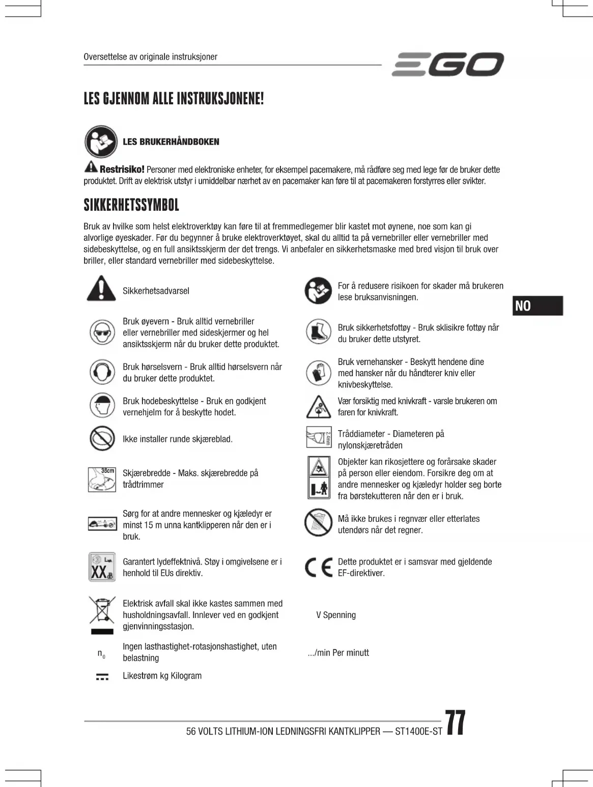 ◾ Ta batteripakken ut av kantklipperen når den ikke er i bruk. ◾ Rengjør verktøyet grundig før du setter det til oppbevaring. ◾ Oppbevar verktøyet på et tørt og godt ventilert sted, innelåst eller høyt plassert, og utilgjengelig for barn. Ikke oppbevar enheten på eller like ved gjødsel, bensin eller andre kjemikalier. Beskytt miljøet Elektrisk utstyr, batteriladere og batterier / oppladbare batterier må ikke kastes i husholdningsavfallet! Ta med dette produktet til autorisert gjenvinning, og gjør det tilgjengelig for separat innsamling. Elektriske verktøy må returneres til et egnet resirkuleringsanlegg.56 VOLTS LITHIUM-ION LEDNINGSFRI KANTKLIPPER — ST1400E-ST82
