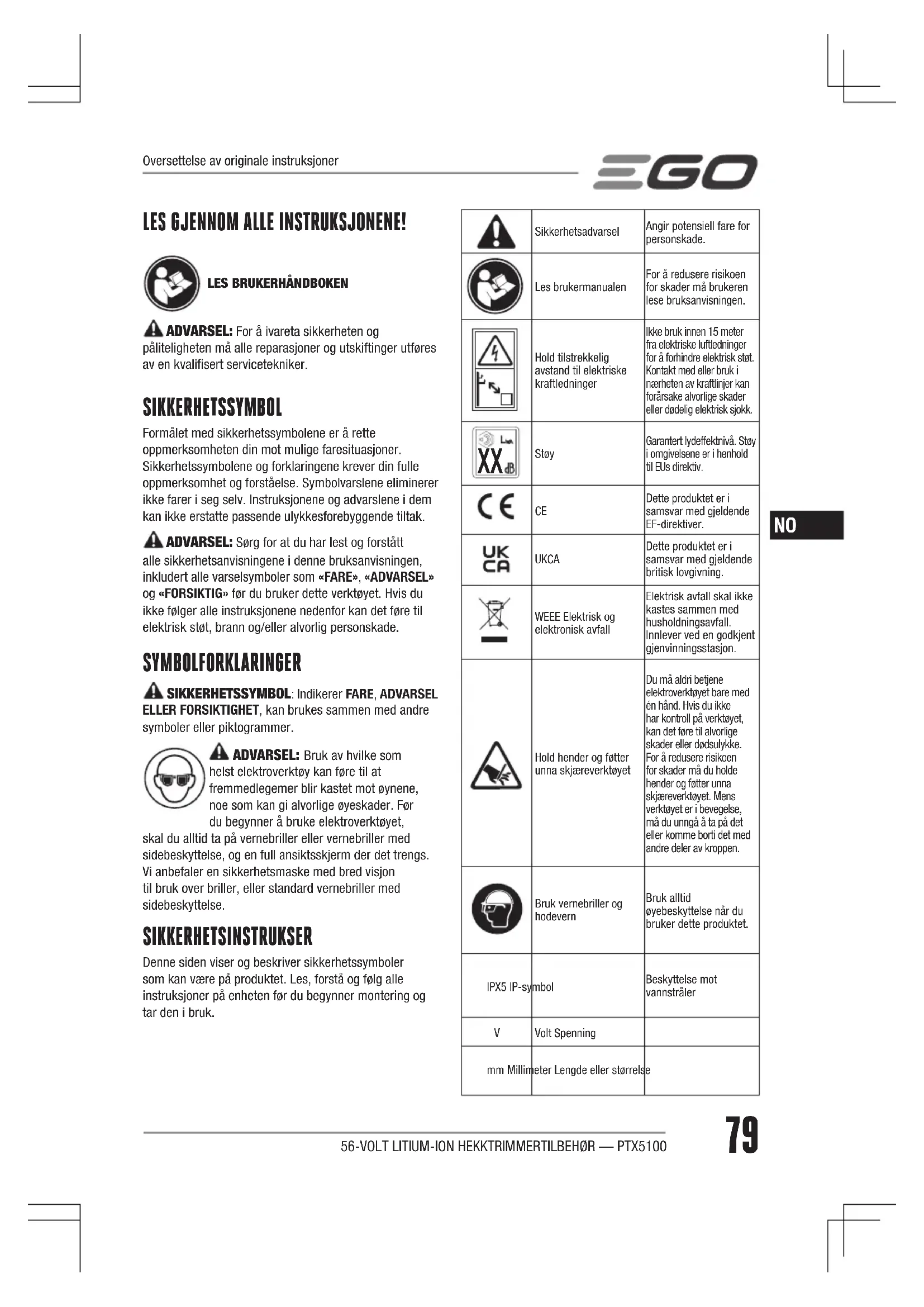 Dette produktet er i samsvar med gjeldende EF-direktiver. UKCA Dette produktet er i samsvar med gjeldende britisk lovgivning. WEEE Elektrisk og elektronisk avfallElektrisk avfall skal ikke kastes sammen med husholdningsavfall. Innlever ved en godkjent gjenvinningsstasjon.Hold hender og føtter unna skjæreverktøyetDu må aldri betjene elektroverktøyet bare med én hånd. Hvis du ikke har kontroll på verktøyet, kan det føre til alvorlige skader eller dødsulykke. For å redusere risikoen for skader må du holde hender og føtter unna skjæreverktøyet. Mens verktøyet er i bevegelse, må du unngå å ta på det eller komme borti det med andre deler av kroppen.Bruk vernebriller og hodevernBruk alltid øyebeskyttelse når du bruker dette produktet.IPX5 IP-symbolBeskyttelse mot vannstråler Volt Spenningmm Millimeter Lengde eller størrelseOversettelse av originale instruksjoner80