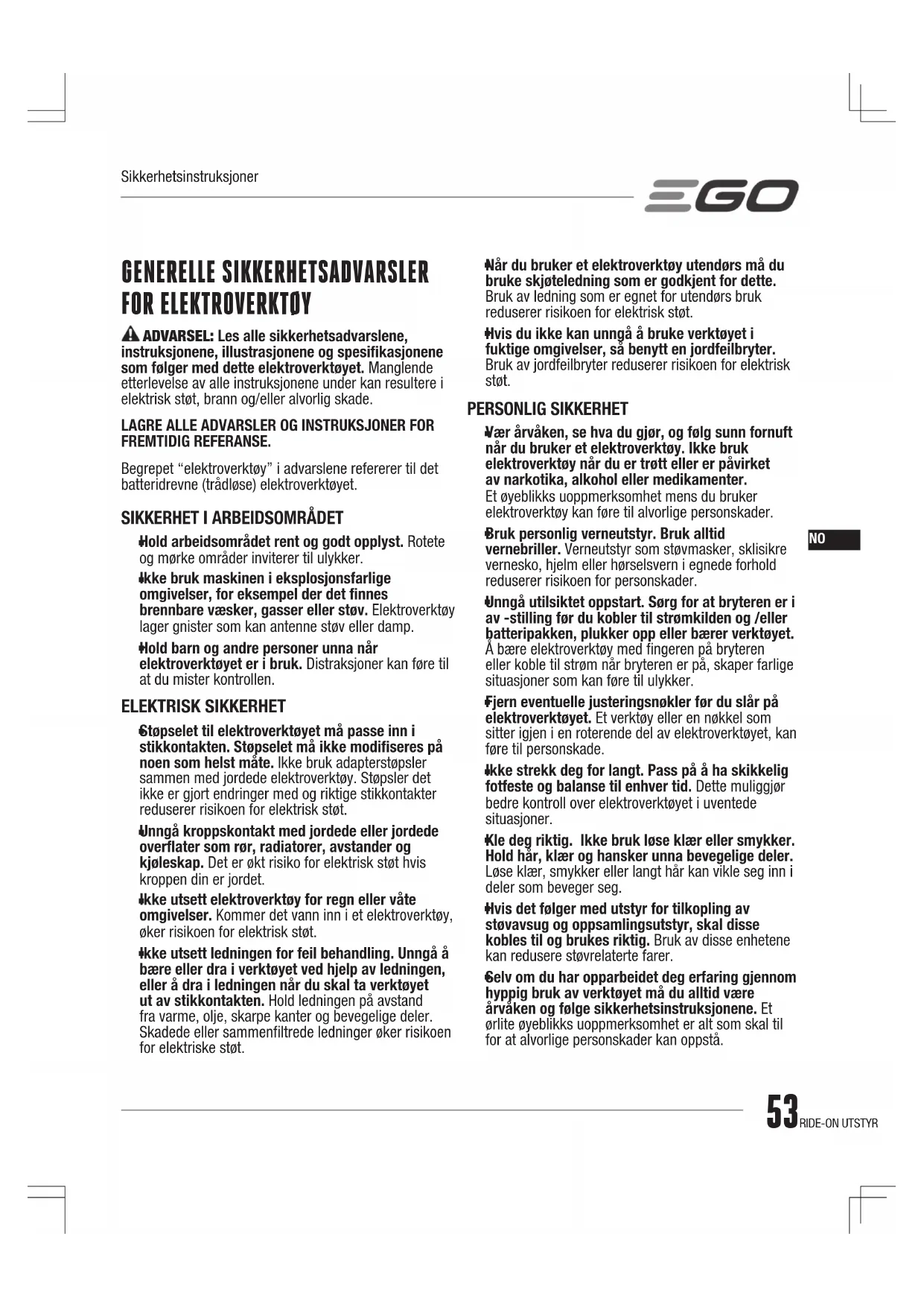 Selv om du har opparbeidet deg erfaring gjennom hyppig bruk av verktøyet må du alltid være årvåken og følge sikkerhetsinstruksjonene. Et ørlite øyeblikks uoppmerksomhet er alt som skal til for at alvorlige personskader kan oppstå. SikkerhetsinstruksjonerRIDE-ON UTSTYR54