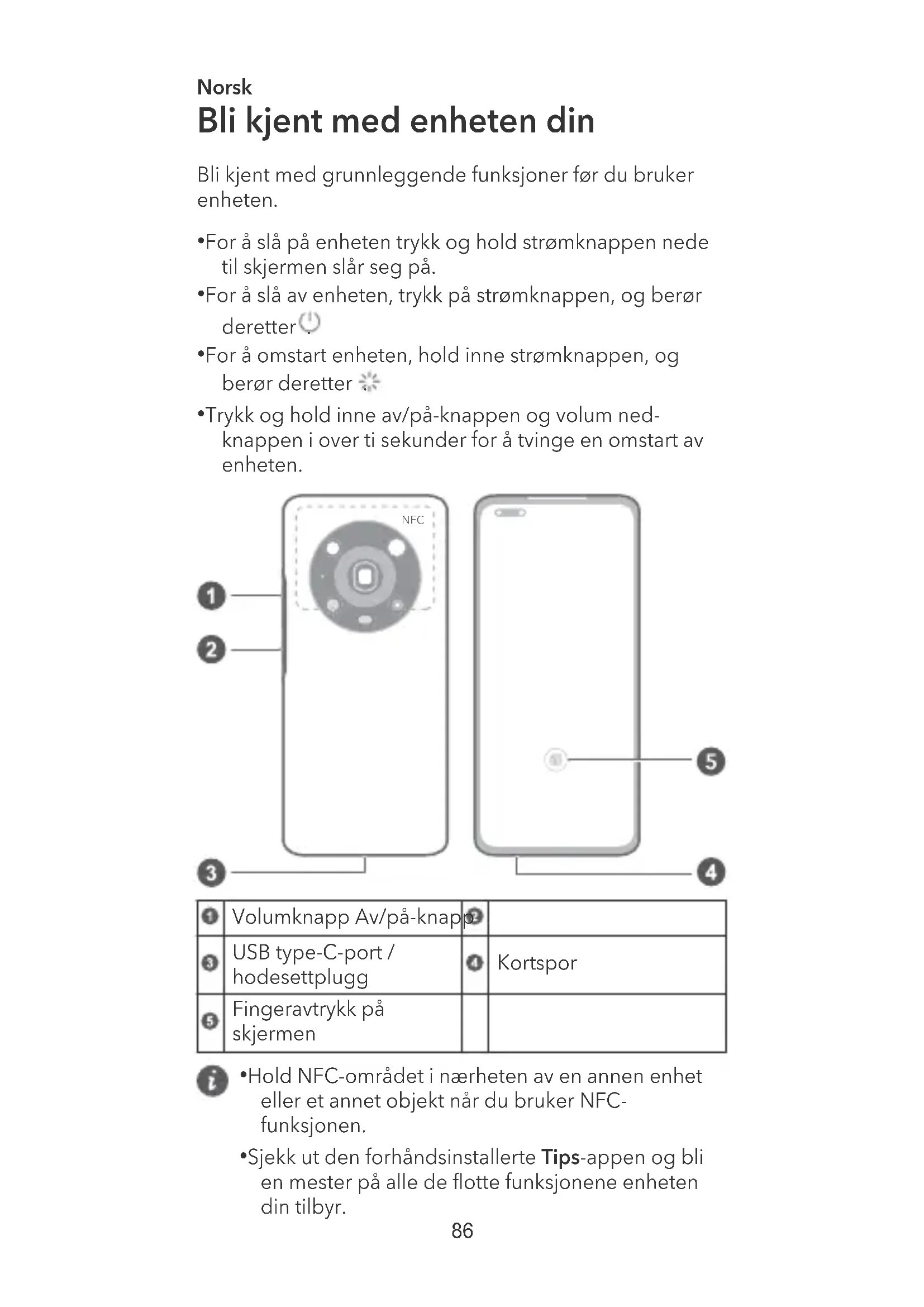 - Sjekk ut den forhåndsinstallerte Tips-appen og bli en mester på alle de otte funksjonene enheten din tilbyr. 86Komme i gang