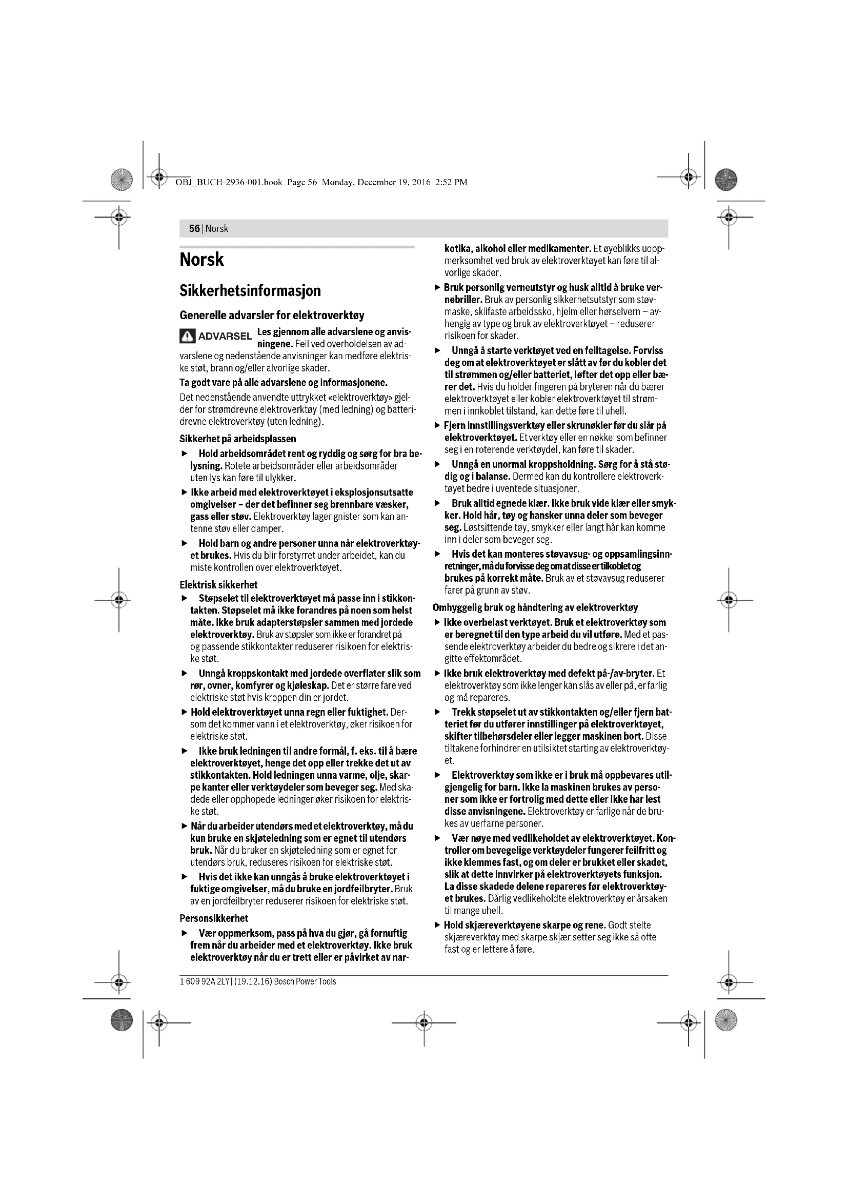 Informasjonene gjelder for nominell spenning [U] på 230 V. Ved avvikende spenning og på visse nasjonale modeller kan disse informasjonene variere noe. OBJ_BUCH-2936-001.book Page 57 Monday, December 19, 2016 2:52 PM58 | Norsk 1 609 92A 2LY | (19.12.16) Bosch Power Tools Støy-/vibrasjonsinformasjon Støyutslippsverdier målt i henhold til EN 60745-2-1. Vibrasjonsnivået som er angitt i disse anvisningene, er målt iht. en målemetode som er standardisert i EN 60745 og kan brukes til sammenligning av elektroverktøy med hverandre. Det egner seg også til en foreløpig vurdering av vibrasjonsbe- lastningen. Det angitte vibrasjonsnivået representerer de hovedsakelige anvendelsene til elektroverktøyet. Men hvis elektroverktøyet brukes til andre anvendelser, med forskjellig tilbehør eller utilstrekkelig vedlikehold, kan vibrasjonsnivået avvike. Dette kan føre til en tydelig øking av vibrasjonsbelastningen over he- le arbeidstidsrommet. Til en nøyaktig vurdering av vibrasjonsbelastningen skal det også tas hensyn til de tidene maskinen er slått av eller går, men ikke virkelig brukes. Dette kan tydelig redusere vibra- sjonsbelastningen over hele arbeidstidsrommet. Bestem ekstra sikkerhetstiltak til beskyttelse av brukeren mot vibrasjonenes virkning, som for eksempel: Vedlikehold av elektroverktøy og innsatsverktøy, holde hendene varme, or- ganisere arbeidsforløpene. Montering Før alle arbeider på elektroverktøyet utføres må støp- selet trekkes ut av stikkontakten. Ekstrahåndtak (se bildeA) Du må ikke bruke elektroverktøyet uten ekstrahåndta- ket 10. Dreiemoment Nm 1,65 1,45 Blokkeringsmoment iht. EN 60745 Nm 17 19 Turtallforvalg