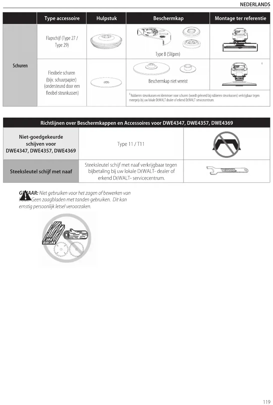 Slipeskiver for andre materialer enn metall og murverk/betong Type A (lukket kapping) To‑type (kombinert kapping og sliping) To‑type slipeskive Type A (lukket kapping) Stålbørsting Hjul‑type stålbørste Type A eller Type B (lukket kapping eller sliping) Hjul‑type stålbørste Beskyttelse unødvendig134 NORSK Retningslinger for beskyttelser og tilbehør for DWE4347, DWE4357, DWE4369 Ikke-godkjente skiver for