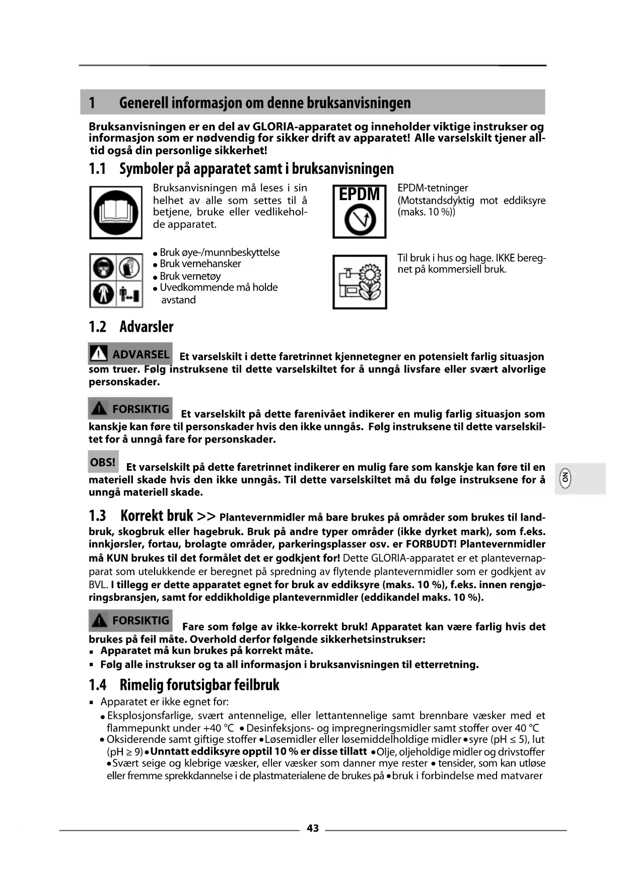 bruk, skogbruk eller hagebruk. Bruk på andre typer områder (ikke dyrket mark), som f.eks. innkjørsler, fortau, brolagte områder, parkeringsplasser osv. er FORBUDT! Plantevernmidler må KUN brukes til det formålet det er godkjent for! Dette GLORIA-apparatet er et plantevernap- parat som utelukkende er beregnet på spredning av flytende plantevernmidler som er godkjent av BVL. I tillegg er dette apparatet egnet for bruk av eddiksyre (maks. 10 %), f.eks. innen rengjø- ringsbransjen, samt for eddikholdige plantevernmidler (eddikandel maks. 10 %). Fare som følge av ikke-korrekt bruk! Apparatet kan være farlig hvis det brukes på feil måte. Overhold derfor følgende sikkerhetsinstrukser: