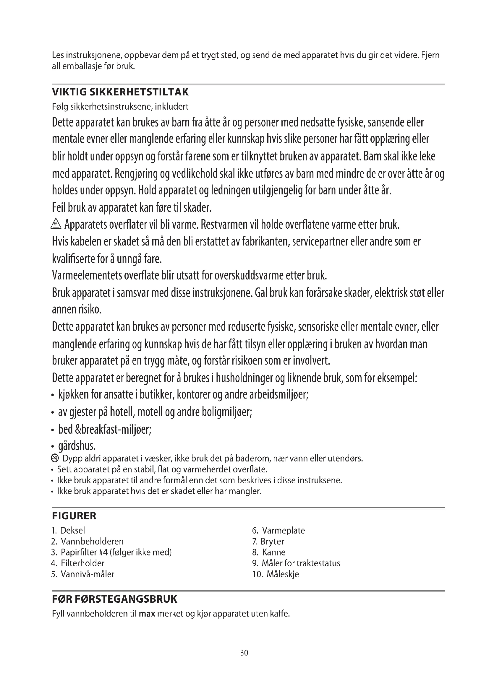 AE30 Les instruksjonene, oppbevar dem på et trygt sted, og send de med apparatet hvis du gir det videre. Fjern all emballasje før bruk. VIKTIG SIKKERHETSTILTAK Følg sikkerhetsinstruksene, inkludert Dette apparatet kan brukes av barn fra åtte år og personer med nedsatte fysiske, sansende eller mentale evner eller manglende erfaring eller kunnskap hvis slike personer har fått opplæring eller blir holdt under oppsyn og forstår farene som er tilknyttet bruken av apparatet. Barn skal ikke leke med apparatet. Rengjøring og vedlikehold skal ikke utføres av barn med mindre de er over åtte år og holdes under oppsyn. Hold apparatet og ledningen utilgjengelig for barn under åtte år. Feil bruk av apparatet kan føre til skader. h Apparatets overflater vil bli varme. Restvarmen vil holde overflatene varme etter bruk. Hvis kabelen er skadet så må den bli erstattet av fabrikanten, servicepartner eller andre som er kvalifiserte for å unngå fare. Varmeelementets overflate blir utsatt for overskuddsvarme etter bruk. Bruk apparatet i samsvar med disse instruksjonene. Gal bruk kan forårsake skader, elektrisk støt eller annen risiko. Dette apparatet kan brukes av personer med reduserte fysiske, sensoriske eller mentale evner, eller manglende erfaring og kunnskap hvis de har fått tilsyn eller opplæring i bruken av hvordan man bruker apparatet på en trygg måte, og forstår risikoen som er involvert. Dette apparatet er beregnet for å brukes i husholdninger og liknende bruk, som for eksempel: