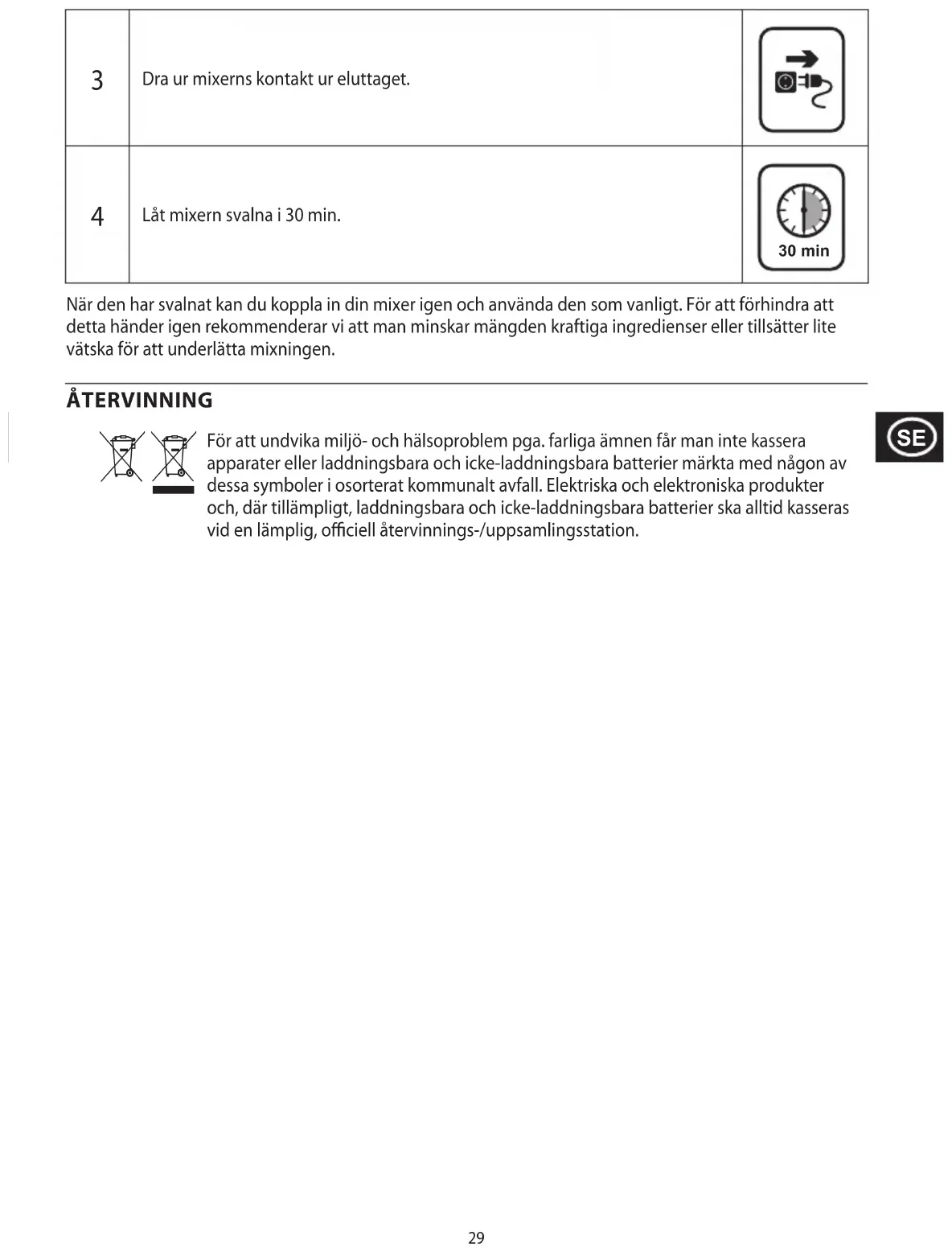 La blenderen kjøle seg ned i 30 minutter. 30 min Etter at den har blitt avkjølt kan du sette i kontakten på blenderen og la den kjøre normalt igjen. For å unngå at dette skjer igjen, anbefaler vi at du reduserer mengden store ingredienser og tilsetter litt væske for å gjøre dem lettere å blande. RESIRKULERING