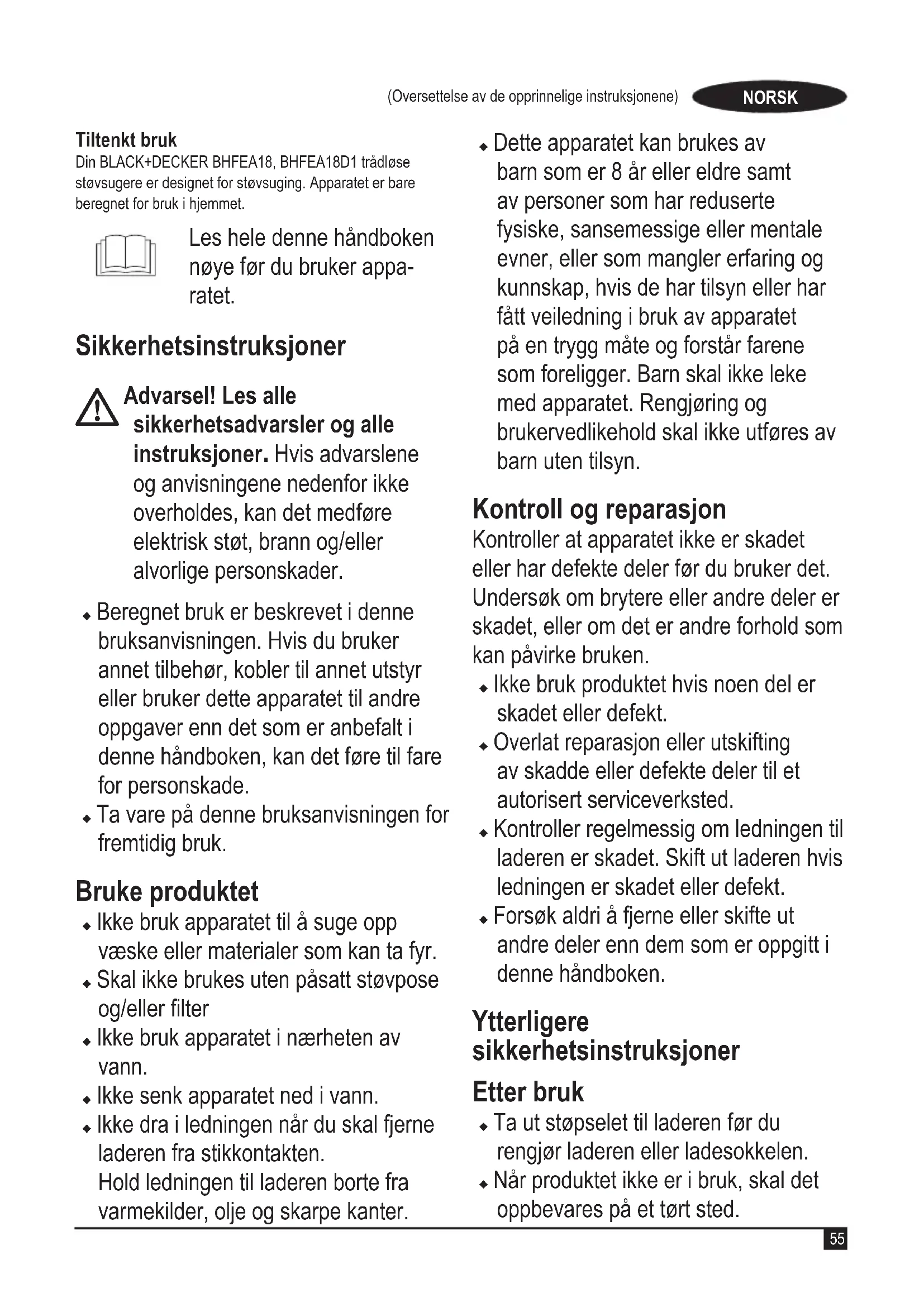 Advarsel! Les alle sikkerhetsadvarsler og alle instruksjoner. Hvis advarslene og anvisningene nedenfor ikke overholdes, kan det medføre elektrisk støt, brann og/eller alvorlige personskader. u Beregnet bruk er beskrevet i denne bruksanvisningen. Hvis du bruker annet tilbehør, kobler til annet utstyr eller bruker dette apparatet til andre oppgaver enn det som er anbefalt i denne håndboken, kan det føre til fare for personskade. u Ta vare på denne bruksanvisningen for fremtidig bruk. Bruke produktet u Ikke bruk apparatet til å suge opp væske eller materialer som kan ta fyr. u Skal ikke brukes uten påsatt støvpose og/eller lter u Ikke bruk apparatet i nærheten av vann. u Ikke senk apparatet ned i vann.u Ikke dra i ledningen når du skal fjerne laderen fra stikkontakten. Hold ledningen til laderen borte fra varmekilder, olje og skarpe kanter. u Dette apparatet kan brukes av barn som er 8 år eller eldre samt av personer som har reduserte fysiske, sansemessige eller mentale evner, eller som mangler erfaring og kunnskap, hvis de har tilsyn eller har fått veiledning i bruk av apparatet på en trygg måte og forstår farene som foreligger. Barn skal ikke leke med apparatet. Rengjøring og brukervedlikehold skal ikke utføres av barn uten tilsyn. Kontroll og reparasjon Kontroller at apparatet ikke er skadet eller har defekte deler før du bruker det. Undersøk om brytere eller andre deler er skadet, eller om det er andre forhold som kan påvirke bruken. u Ikke bruk produktet hvis noen del er skadet eller defekt. u Overlat reparasjon eller utskifting av skadde eller defekte deler til et autorisert serviceverksted. u Kontroller regelmessig om ledningen til laderen er skadet. Skift ut laderen hvis ledningen er skadet eller defekt. u Forsøk aldri å fjerne eller skifte ut andre deler enn dem som er oppgitt i denne håndboken. Ytterligere sikkerhetsinstruksjoner Etter bruk u Ta ut støpselet til laderen før du rengjør laderen eller ladesokkelen. u Når produktet ikke er i bruk, skal det oppbevares på et tørt sted.56 (Oversettelse av de opprinnelige instruksjonene) NORSK u Barn skal ikke ha tilgang til apparater som oppbevares. Restrisikoer Når verktøyet brukes, kan det oppstå ytterligere risikoer som kanskje ikke er beskrevet i de medfølgende sikkerhetsadvarslene. Disse risikoene kan bli forårsaket av feil bruk, langvarig bruk osv. Selv om de relevante sikkerhetsbestemmelsene blir fulgt, og sikkerhetstiltakene blir gjennomført, kan visse gjenværende risikoer ikke unngås. Disse inkluderer: u Personskader som forårsakes av berøring av en roterende/bevegelig del. u Personskader som oppstår ved skifte av deler, blader eller tilbehør. u Personskader som skyldes for lang tids bruk av verktøyet. Når du bruker et verktøy i lange perioder, må du sørge for å ta regelmessige pauser. u Hørselskader.u Helsefarer forårsaket av innånding av støv som utvikler seg når du bruker verktøyet (eksempel: arbeid med tre, spesielt eik, bøk og MDF). Batterier og ladere Batterier (kan selges separat) u Oppladbare batterier skal tas ut av apparatet før lading. u Batteriene må settes inn rett vei (polaritet). u Brukte batterier skal tas ut av apparatet og avhendes på trygg måte. u Hvis apparatet skal lagres ubrukt over lengre perioder, skal batteriene tas ut. u Strømkontaktene må ikke kortsluttes.u Forsøk aldri å åpne av noen årsak.u Ikke utsett batteriet for vann.u Ikke utsett batteriet for varme.u Ikke oppbevar det på steder hvor temperaturen kan komme over 40 °C. u Lad bare ved temperaturer mellom 10°C og 40°C. u Bruk bare den laderen som følger med apparatet/verktøyet. Hvis du bruker feil lader, kan dette føre til et elektrisk støt eller at batteriet overopphetes. u Følg instruksjonene i avsnittet “Miljøvern” når du skal kaste batterier. u Ikke skad eller deformer batteripakken ved punktering eller støt, da dette kan føre til risiko for personskade og brann. u Du må ikke lade skadede batterier.u Under ekstreme forhold kan batterilekkasje forekomme. Hvis du oppdager væske på batteriene, må du tørke den forsiktig av med en klut. Unngå kontakt med huden. u Hvis væsken kommer i kontakt med huden eller øynene, følger du instruksjonene nedenfor. Advarsel! Batterivæsken kan føre til personskade eller skade på eiendom. Ved hudkontakt skyller du umiddelbart med vann. Hvis huden blir rød eller irritert eller smerter inntreffer, søk øyeblikkelig medisinsk hjelp.57 (Oversettelse av de opprinnelige instruksjonene)NORSK Hvis væsken kommer i kontakt med øynene, skyller du umiddelbart med rent vann og søker øyeblikkelig medisinsk hjelp. Ladere (kan selges separat) Laderen er konstruert for en bestemt spenning. Kontroller alltid at nettspenningen er i overensstemmelse med spenningen på typeskiltet og angivelsene under tekniske data. Advarsel! Ikke skift ut laderen med et vanlig nettstøpsel. u Bruk bare BLACK+DECKER-laderen til å lade batteriet i apparatet som laderen ble levert sammen med. Andre batterier kan sprekke og føre til personskade og materiell skade. u Prøv aldri å lade ikke-oppladbare batterier. u Hvis strømledningen blir skadet, må den byttes av produsenten eller et autorisert BLACK+DECKER- servicesenter for å unngå fare. u Ikke utsett laderen for vann.u Ikke åpne laderen.u Ikke stikk gjenstander eller ngre inn i laderen. u Apparatet, verktøyet eller batteriet må plasseres på et sted med god gjennomlufting under ladning. Elektrisk sikkerhet Symboler på laderen Les hele denne håndboken nøye før du bruker produktet.