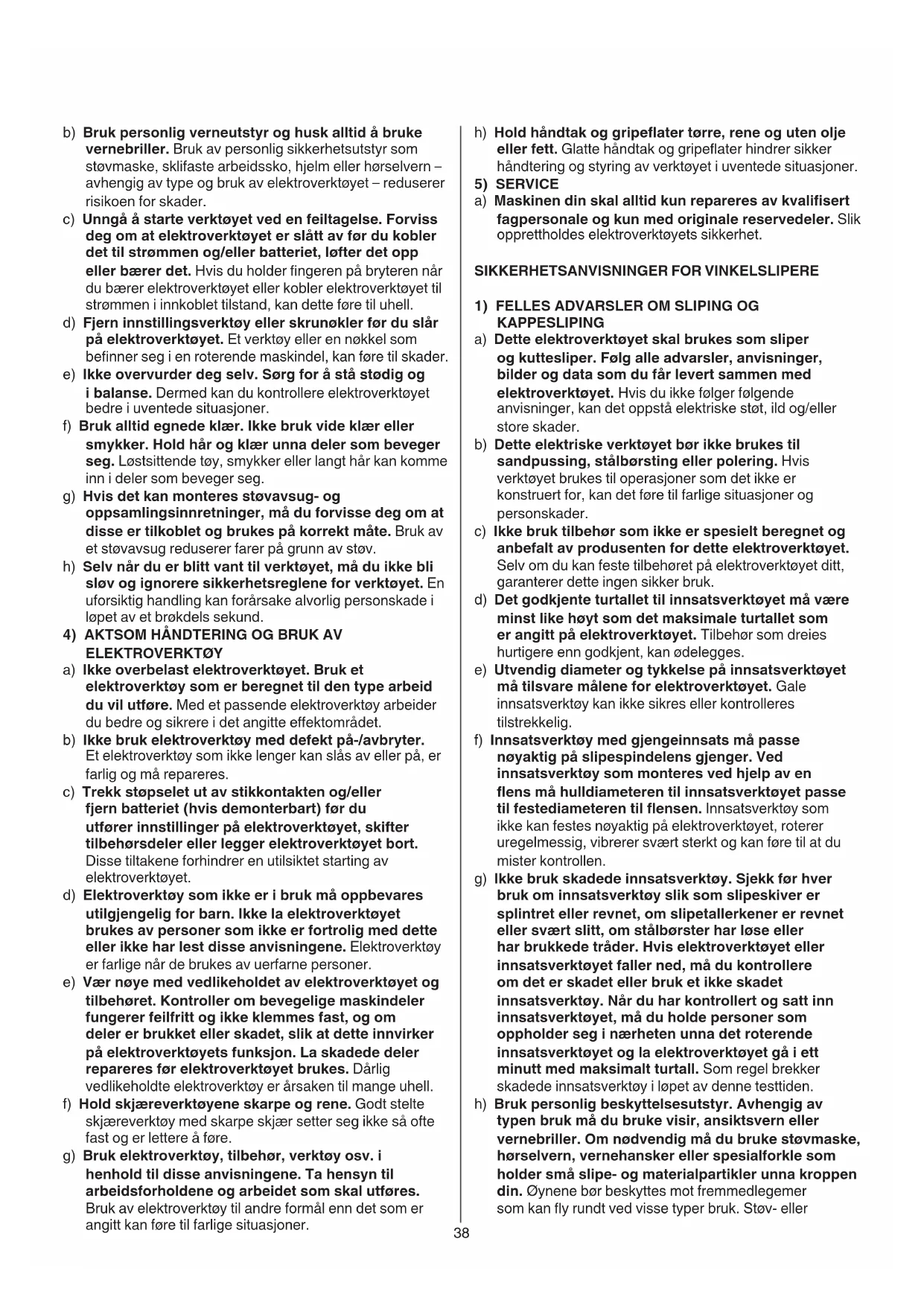 ELEKTROVERKTØY a) Ikke overbelast elektroverktøyet. Bruk et elektroverktøy som er beregnet til den type arbeid du vil utføre. Med et passende elektroverktøy arbeider du bedre og sikrere i det angitte eektområdet. b) Ikke bruk elektroverktøy med defekt på-/avbryter. Et elektroverktøy som ikke lenger kan slås av eller på, er farlig og må repareres. c) Trekk støpselet ut av stikkontakten og/eller fjern batteriet (hvis demonterbart) før du utfører innstillinger på elektroverktøyet, skifter tilbehørsdeler eller legger elektroverktøyet bort. Disse tiltakene forhindrer en utilsiktet starting av elektroverktøyet. d) Elektroverktøy som ikke er i bruk må oppbevares utilgjengelig for barn. Ikke la elektroverktøyet brukes av personer som ikke er fortrolig med dette eller ikke har lest disse anvisningene. Elektroverktøy er farlige når de brukes av uerfarne personer. e) Vær nøye med vedlikeholdet av elektroverktøyet og tilbehøret. Kontroller om bevegelige maskindeler fungerer feilfritt og ikke klemmes fast, og om deler er brukket eller skadet, slik at dette innvirker på elektroverktøyets funksjon. La skadede deler repareres før elektroverktøyet brukes. Dårlig vedlikeholdte elektroverktøy er årsaken til mange uhell. f) Hold skjæreverktøyene skarpe og rene. Godt stelte skjæreverktøy med skarpe skjær setter seg ikke så ofte fast og er lettere å føre. g) Bruk elektroverktøy, tilbehør, verktøy osv. i henhold til disse anvisningene. Ta hensyn til arbeidsforholdene og arbeidet som skal utføres. Bruk av elektroverktøy til andre formål enn det som er angitt kan føre til farlige situasjoner.39 b) Hold aldri hånden i nærheten av det roterende innsatsverktøyet. Innsatsverktøyet kan bevege seg over hånden din ved tilbakeslag. c) Unngå at kroppen din benner seg i området der elektroverktøyet vil bevege seg ved et tilbakeslag. Tilbakeslaget driver elektroverktøyet i motsatt retning av slipeskivens dreieretning på blokkeringsstedet. d) Vær spesielt forsiktig i hjørner, på skarpe kanter osv. Du må forhindre at innsatsverktøy avprelles fra arbeidsstykket eller klemmes fast. Det roterende innsatsverktøyet har en tendens til å klemmes fast i hjørner, på skarpe kanter eller hvis det avprelles. Dette forårsaker kontrolltap eller tilbakeslag. e) Bruk ikke kjedesagblad eller tannet sagblad. Slike innsatsverktøy fører ofte til tilbakeslag eller til at man mister kontrollen over elektroverktøyet.