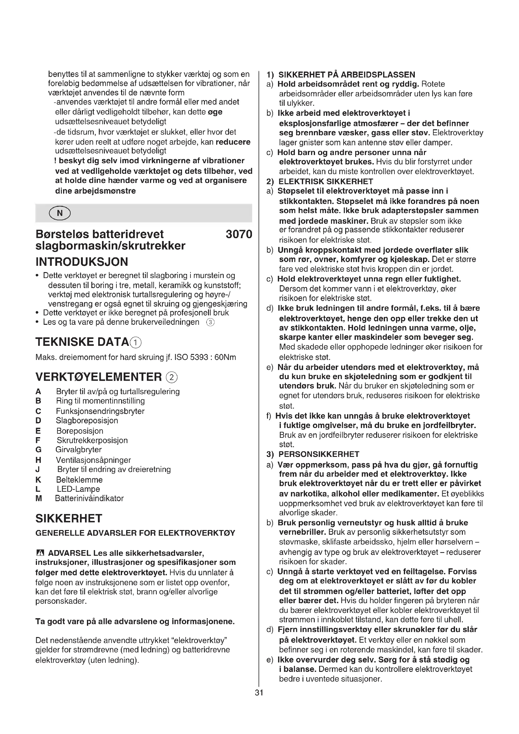 BRUKSOMRÅDER a) Bruk hørselsvern ved slagboring. Å være utsatt for støy kan medføre hørselstap. b) Hold elektroverktøyet i de isolerte håndtakene når du utfører en operasjon hvor kutteverktøyet eller festet kan komme i kontakt med skjulte ledninger. Metalldelene på kutteverktøy og fester som kommer i berøring med strømførende ledninger kan bli strømførende og brukeren kan få elektrisk støt.