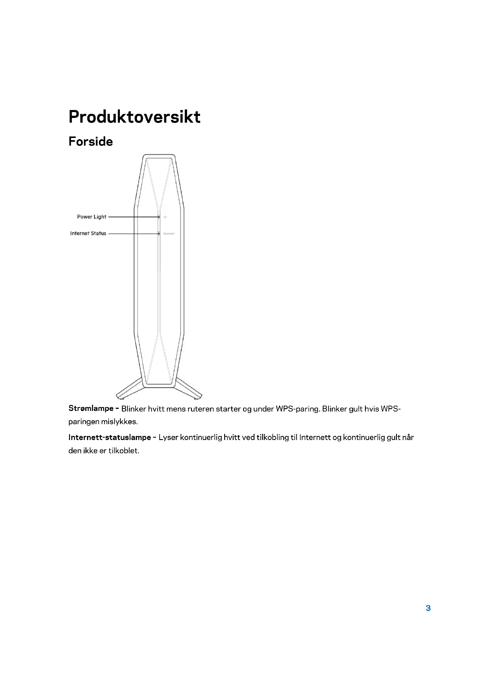- Omgivelser Produktoversikt Forside Strømlampe – Blinker hvitt mens ruteren starter og under WPS-paring. Blinker gult hvis WPS- paringen mislykkes. Internett-statuslampe – Lyser kontinuerlig hvitt ved tilkobling til Internett og kontinuerlig gult når den ikke er tilkoblet.4 Bakside Wi-Fi Protected Setup™ (WPS)-knapp (1) - -- Trykk for enkelt å konfigurere trådløs sikkerhet på Wi-Fi Protected Setup-aktiverte nettverksenheter. Lyset under knappen blinker mens WPS- sammenkoblingen er aktiv. Reset-knapp (2) – Trykk og hold inne til strømlampen begynner å blinke for å tilbakestille ruteren til fabrikkinnstillinger. Ethernet-porter (3) - -- Koble Ethernet-kabler (også kalt nettverks- eller Internett-kabler) til disse Fast Ethernet-portene (10/100/1000) og til andre kabelbaserte enheter på nettverket. Lysene under portene lyser bare når en Ethernet-kabel er koblet til og det er datatrafikk på kabelen. Internett-port (4) – Koble en Ethernet-kabel til denne porten og til modemet. Lyset under porten lyser bare når en Ethernet-kabel er koblet til og det er datatrafikk på kabelen. USB 3.0 port (5) - -- Koble til og del en USB-stasjon på nettverket. Strømport (6) - -- Koble den medfølgende strømadapteren til denne porten. Strømbryter (7) - -- Trykk på | (PÅ) for å slå på ruteren.5 Oppsett: Grunnleggende Her finner du mer hjelp I tillegg til denne brukerhåndboken kan du finne hjelp på Belkin.com/support/RT1800 (dokumentasjon, nedlastinger, ofte stilte spørsmål, teknisk support, live chat, forum) Merk – Lisenser og merknader om tredjeparts programvare brukt i dette produktet er tilgjengelig på https://www.belkin.com/support/license/ . Kontakt https://www.belkin.com/support/gplcodecenter/ for spørsmål eller forespørsler om GPL- kildekode. Slik installerer du ruteren Vil du legge denne ruteren til det eksisterende mesh-nettverket? Hvis du har brukt denne ruteren før, må du tilbakestille den til fabrikkinnstillingene før du legger den til nettverket ditt. Du kan gjøre dette i Administrasjon-fanen i ruterenes innstillinger eller ved å trykke på Reset-knappen på baksiden av ruteren og holde den inne i 10 sekunder. p. 223