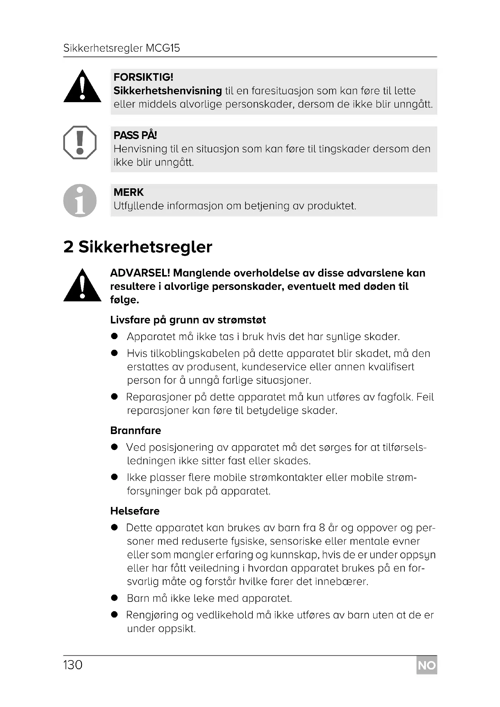 ADVARSEL! Manglende overholdelse av disse advarslene kan resultere i alvorlige personskader, eventuelt med døden til følge. Livsfare på grunn av strømstøt Apparatet må ikke tas i bruk hvis det har synlige skader. Hvis tilkoblingskabelen på dette apparatet blir skadet, må den erstattes av produsent, kundeservice eller annen kvalifisert person for å unngå farlige situasjoner. Reparasjoner på dette apparatet må kun utføres av fagfolk. Feil reparasjoner kan føre til betydelige skader. Brannfare Ved posisjonering av apparatet må det sørges for at tilførsels- ledningen ikke sitter fast eller skades. Ikke plasser flere mobile strømkontakter eller mobile strøm- forsyninger bak på apparatet. Helsefare Dette apparatet kan brukes av barn fra 8 år og oppover og per- soner med reduserte fysiske, sensoriske eller mentale evner eller som mangler erfaring og kunnskap, hvis de er under oppsyn eller har fått veiledning i hvordan apparatet brukes på en for- svarlig måte og forstår hvilke farer det innebærer. Barn må ikke leke med apparatet. Rengjøring og vedlikehold må ikke utføres av barn uten at de er under oppsikt. FORSIKTIG! Sikkerhetshenvisning til en faresituasjon som kan føre til lette eller middels alvorlige personskader, dersom de ikke blir unngått. PASS PÅ! Henvisning til en situasjon som kan føre til tingskader dersom den ikke blir unngått. MERK Utfyllende informasjon om betjening av produktet. MobicoolMCG15_OPM_4445103306_EMEA16_202x-xx-xx.book Seite 130 Freitag, 16. April 2021 2:17 14NO MCG15 Sikkerhetsregler