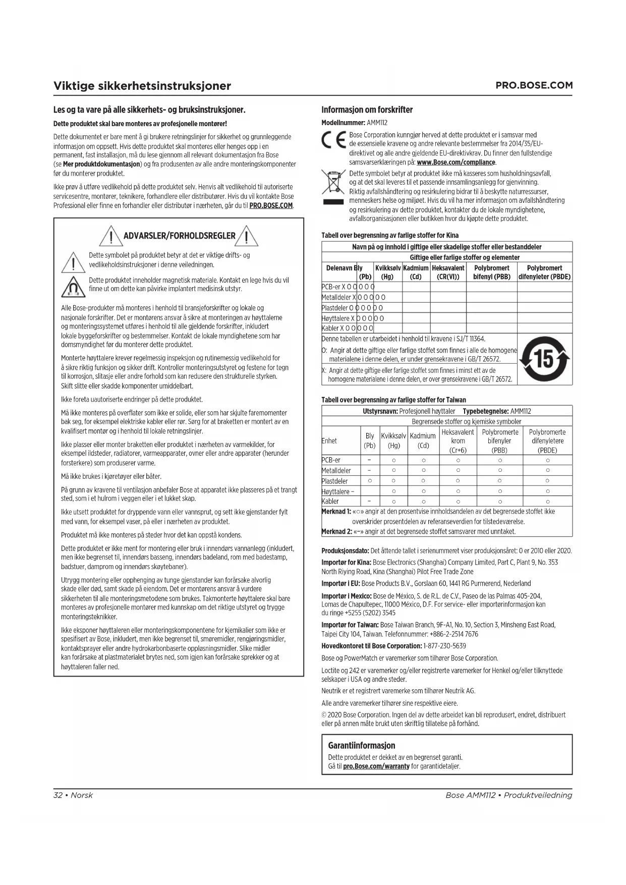 Viktige sikkerhetsinstruksjoner Les og ta vare på alle sikkerhets- og bruksinstruksjoner. Dette produktet skal bare monteres av profesjonelle montører! Dette dokumentet er bare ment å gi brukere retningslinjer for sikkerhet og grunnleggende informasjon om oppsett. Hvis dette produktet skal monteres eller henges opp i en permanent, fast installasjon, må du lese gjennom all relevant dokumentasjon fra Bose (se Mer produktdokumentasjon) og fra produsenten av alle andre monteringskomponenter før du monterer produktet. Ikke prøv å utføre vedlikehold på dette produktet selv. Henvis alt vedlikehold til autoriserte servicesentre, montører, teknikere, forhandlere eller distributører. Hvis du vil kontakte Bose Professional eller finne en forhandler eller distributør i nærheten, går du til PRO.BOSE.COM. Informasjon om forskrifter Modellnummer: AMM112 Bose Corporation kunngjør herved at dette produktet er i samsvar med de essensielle kravene og andre relevante bestemmelser fra 2014/35/EU- direktivet og alle andre gjeldende EU-direktivkrav. Du finner den fullstendige samsvarserklæringen på: www.Bose.com/compliance. Dette symbolet betyr at produktet ikke må kasseres som husholdningsavfall, og at det skal leveres til et passende innsamlingsanlegg for gjenvinning. Riktig avfallshåndtering og resirkulering bidrar til å beskytte naturressurser, menneskers helse og miljøet. Hvis du vil ha mer informasjon om avfallshåndtering og resirkulering av dette produktet, kontakter du de lokale myndighetene, avfallsorganisasjonen eller butikken hvor du kjøpte dette produktet. Tabell over begrensning av farlige stoer for Kina Navn på og innhold i giftige eller skadelige stoer eller bestanddeler Giftige eller farlige stoer og elementer Delenavn Bly (Pb) Kvikksølv (Hg) Kadmium (Cd) Heksavalent (CR(VI)) Polybromert bifenyl (PBB) Polybromert difenyleter (PBDE) PCB-er X O O O O O Metalldeler X O O O O O Plastdeler O O O O O O Høyttalere X O O O O O Kabler X O O O O O Denne tabellen er utarbeidet i henhold til kravene i SJ/T 11364. O: Angir at dette giftige eller farlige stoet som finnes i alle de homogene materialene i denne delen, er under grensekravene i GB/T 26572. X: Angir at dette giftige eller farlige stoet som finnes i minst ett av de homogene materialene i denne delen, er over grensekravene i GB/T 26572. Tabell over begrensning av farlige stoer for Taiwan Utstyrsnavn: Profesjonell høyttaler Typebetegnelse: AMM112 Begrensede stoer og kjemiske symboler Enhet Bly (Pb) Kvikksølv (Hg) Kadmium (Cd) Heksavalent krom (Cr+6) Polybromerte bifenyler (PBB) Polybromerte difenyletere (PBDE) PCB-er −