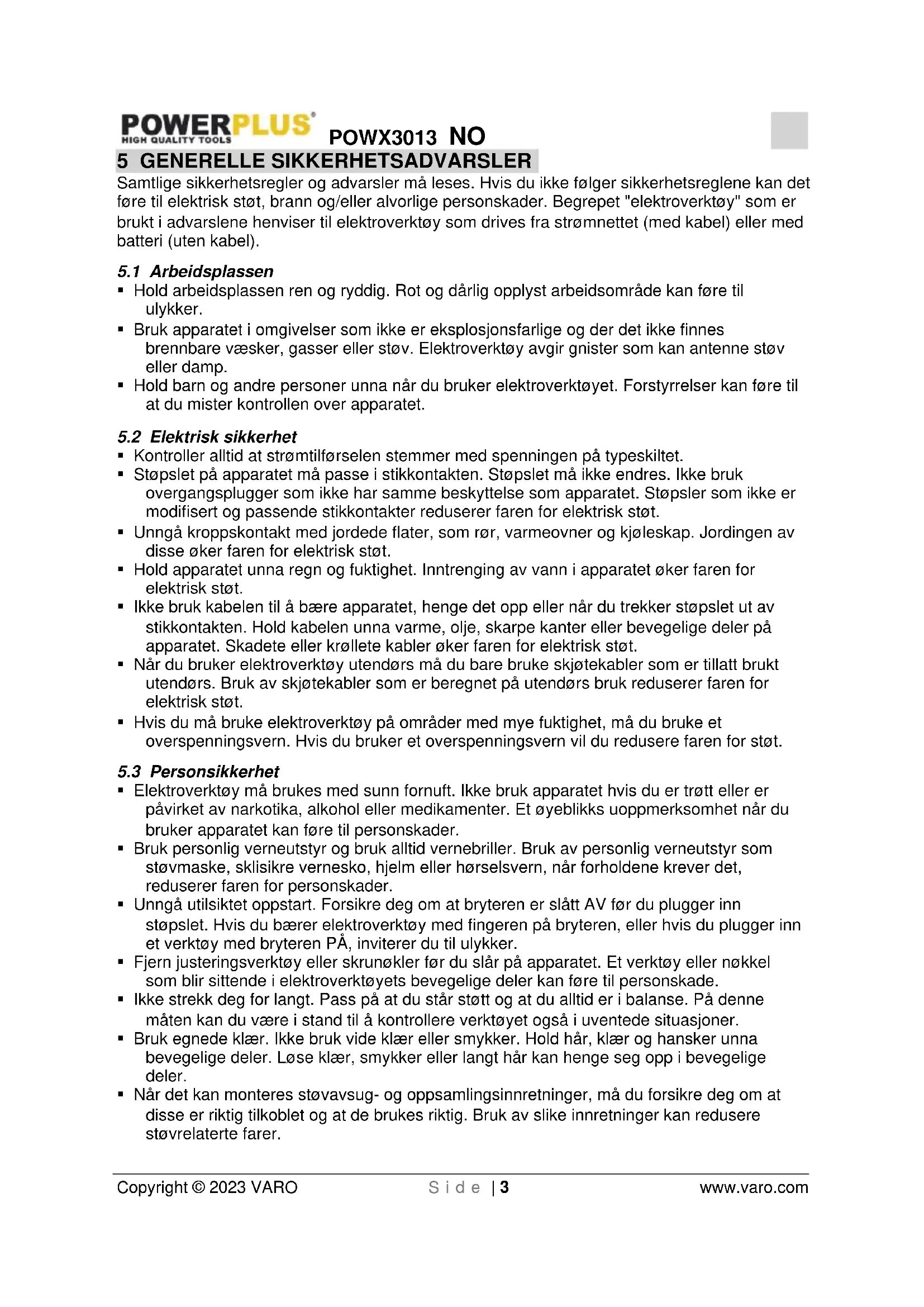 - Når det kan monteres støvavsug- og oppsamlingsinnretninger, må du forsikre deg om at disse er riktig tilkoblet og at de brukes riktig. Bruk av slike innretninger kan redusere støvrelaterte farer.POWX3013 NO Copyright © 2023 VARO S i d e | 4 www.varo.com