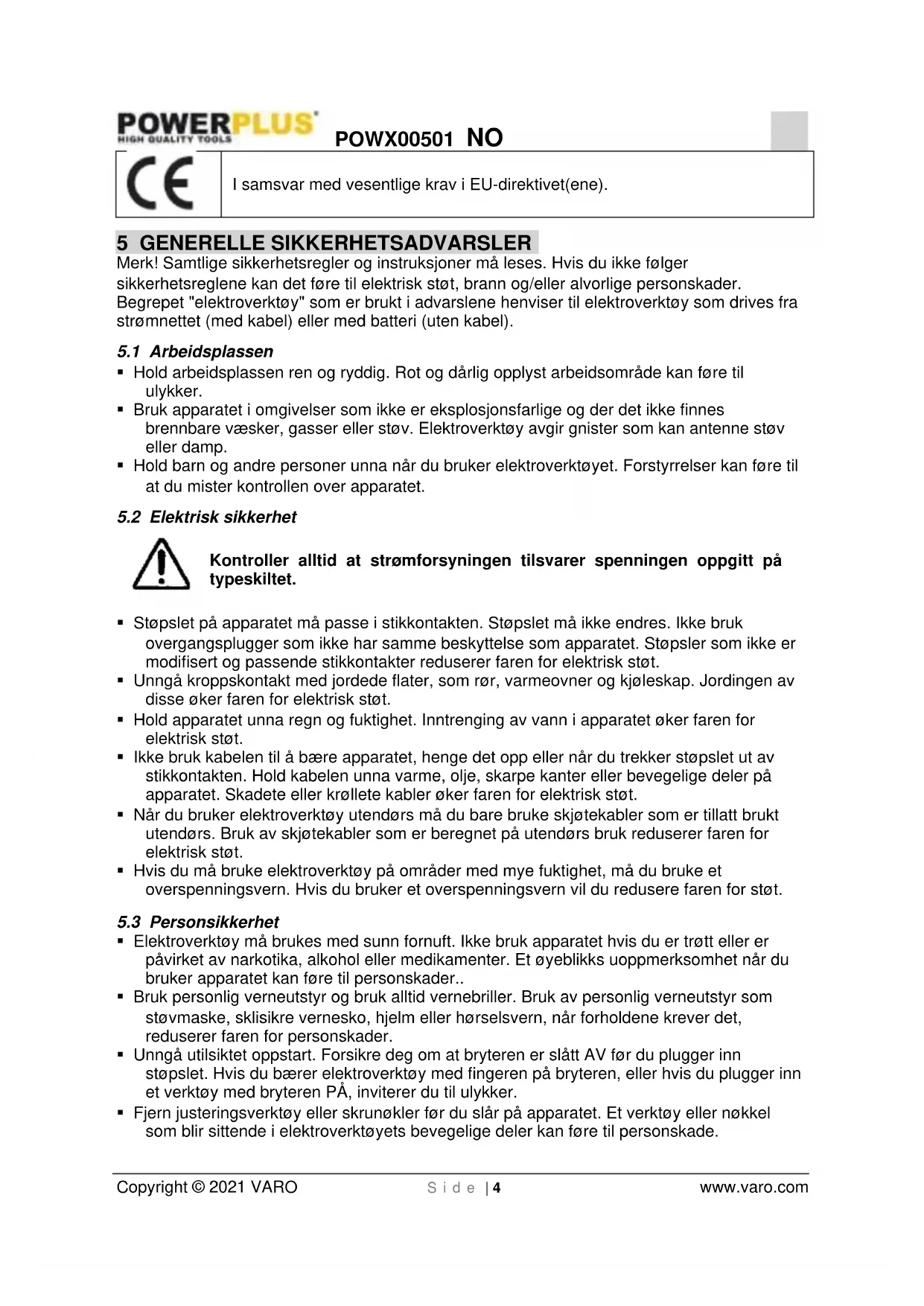 - Fjern justeringsverktøy eller skrunøkler før du slår på apparatet. Et verktøy eller nøkkel som blir sittende i elektroverktøyets bevegelige deler kan føre til personskade.POWX00501 NO Copyright © 2021 VARO S i d e | 5 www.varo.com