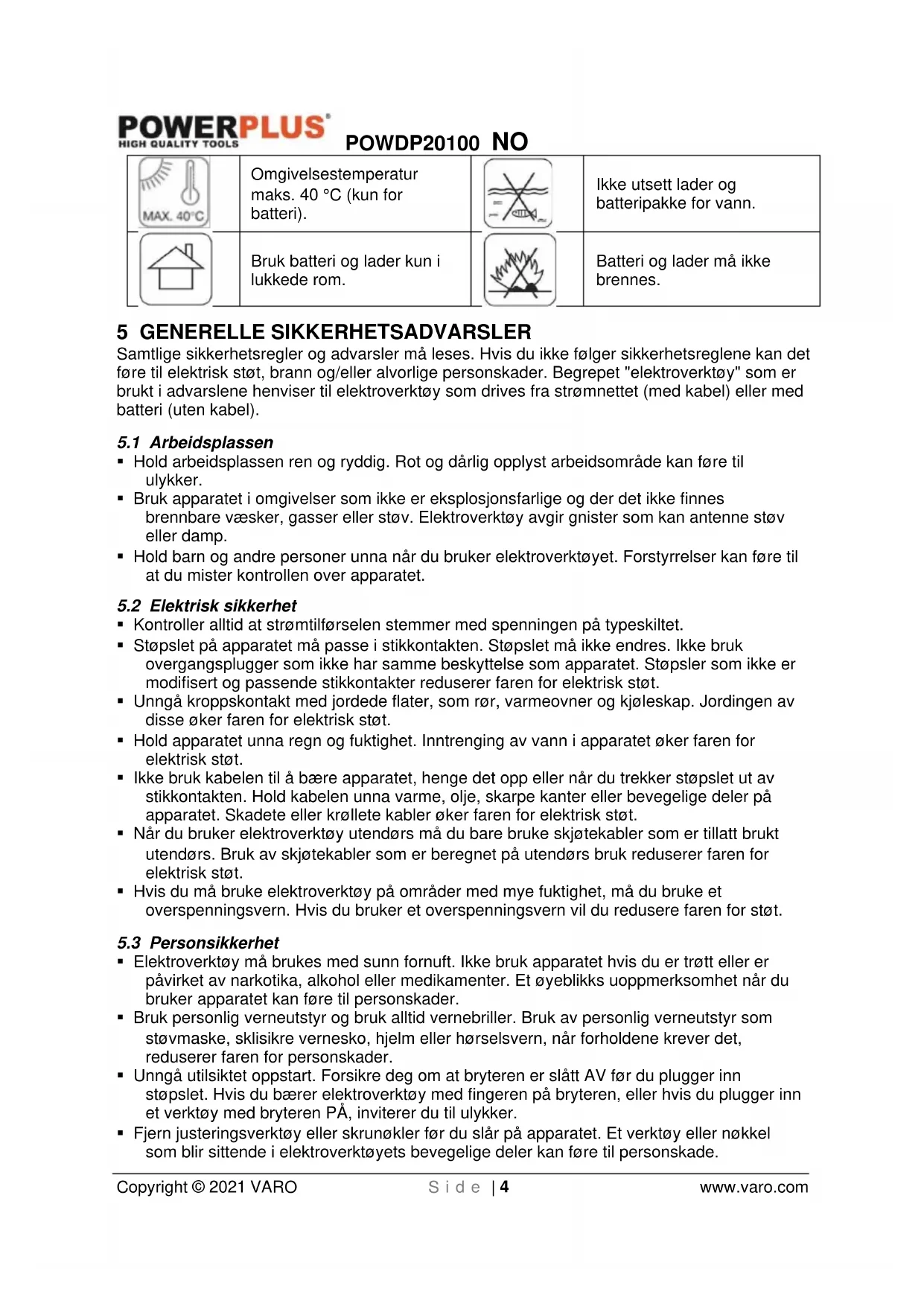 - Følg alle ladeinstruksjonene og unngå å lade batteripakken utenfor temperaturområdet som står spesifisert i instruksjonene. Feil lading eller lading utenfor angitt temperaturområde øker risikoen for brann.POWDP20100 NO Copyright © 2021 VARO S i d e | 6 www.varo.com