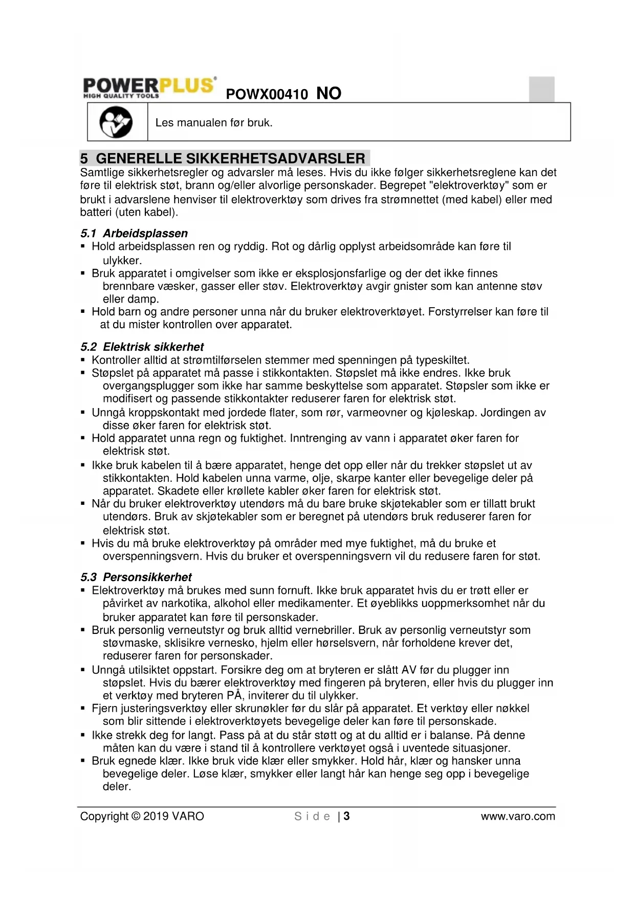 - Bruk egnede klær. Ikke bruk vide klær eller smykker. Hold hår, klær og hansker unna bevegelige deler. Løse klær, smykker eller langt hår kan henge seg opp i bevegelige deler.POWX00410 NO Copyright © 2019 VARO S i d e | 4 www.varo.com