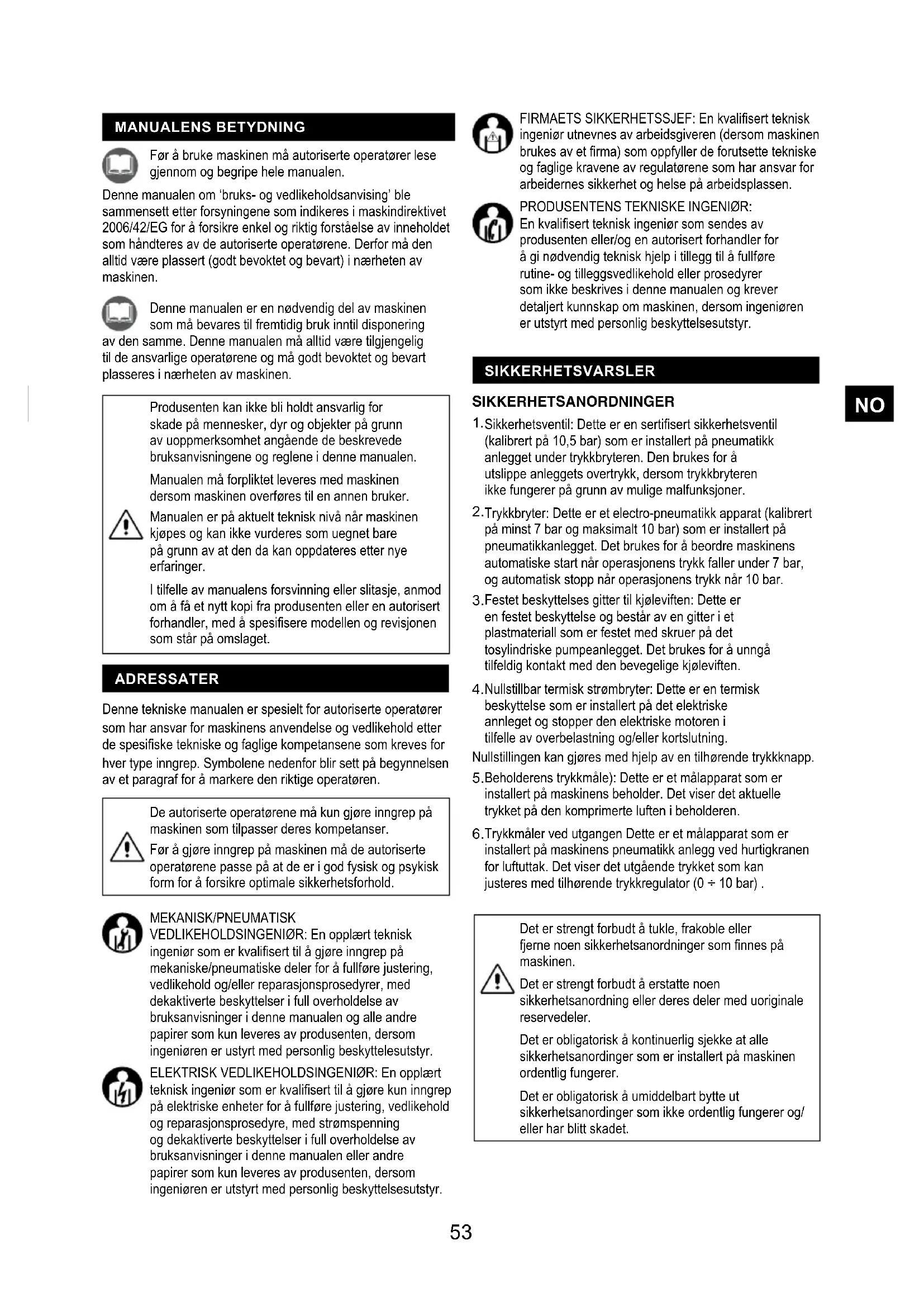 GARANTI .................................................................................................................................202FIRMAETS SIKKERHETSSJEF: En kvalisert teknisk ingeniør utnevnes av arbeidsgiveren (dersom maskinen brukes av et rma) som oppfyller de forutsette tekniske og faglige kravene av regulatørene som har ansvar for arbeidernes sikkerhet og helse på arbeidsplassen. PRODUSENTENS TEKNISKE INGENIØR: En kvalisert teknisk ingeniør som sendes av produsenten eller/og en autorisert forhandler for å gi nødvendig teknisk hjelp i tillegg til å fullføre rutine- og tilleggsvedlikehold eller prosedyrer som ikke beskrives i denne manualen og krever detaljert kunnskap om maskinen, dersom ingeniøren er utstyrt med personlig beskyttelsesutstyr. MEKANISK/PNEUMATISK VEDLIKEHOLDSINGENIØR: En opplært teknisk ingeniør som er kvalisert til å gjøre inngrep på mekaniske/pneumatiske deler for å fullføre justering, vedlikehold og/eller reparasjonsprosedyrer, med dekaktiverte beskyttelser i full overholdelse av bruksanvisninger i denne manualen og alle andre papirer som kun leveres av produsenten, dersom ingeniøren er ustyrt med personlig beskyttelesutstyr. ELEKTRISK VEDLIKEHOLDSINGENIØR: En opplært teknisk ingeniør som er kvalisert til å gjøre kun inngrep på elektriske enheter for å fullføre justering, vedlikehold og reparasjonsprosedyre, med strømspenning og dekaktiverte beskyttelser i full overholdelse av bruksanvisninger i denne manualen eller andre papirer som kun leveres av produsenten, dersom ingeniøren er utstyrt med personlig beskyttelsesutstyr. Denne tekniske manualen er spesielt for autoriserte operatører som har ansvar for maskinens anvendelse og vedlikehold etter de spesiske tekniske og faglige kompetansene som kreves for hver type inngrep. Symbolene nedenfor blir sett på begynnelsen av et paragraf for å markere den riktige operatøren. Denne manualen er en nødvendig del av maskinen som må bevares til fremtidig bruk inntil disponering av den samme. Denne manualen må alltid være tilgjengelig til de ansvarlige operatørene og må godt bevoktet og bevart plasseres i nærheten av maskinen. Før å bruke maskinen må autoriserte operatører lese gjennom og begripe hele manualen. Denne manualen om ‘bruks- og vedlikeholdsanvising’ ble sammensett etter forsyningene som indikeres i maskindirektivet 2006/42/EG for å forsikre enkel og riktig forståelse av inneholdet som håndteres av de autoriserte operatørene. Derfor må den alltid være plassert (godt bevoktet og bevart) i nærheten av maskinen. MANUALENS BETYDNING ADRESSATER SIKKERHETSVARSLER Produsenten kan ikke bli holdt ansvarlig for skade på mennesker, dyr og objekter på grunn av uoppmerksomhet angående de beskrevede bruksanvisningene og reglene i denne manualen. Manualen må forpliktet leveres med maskinen dersom maskinen overføres til en annen bruker. Manualen er på aktuelt teknisk nivå når maskinen kjøpes og kan ikke vurderes som uegnet bare på grunn av at den da kan oppdateres etter nye erfaringer. I tilfelle av manualens forsvinning eller slitasje, anmod om å få et nytt kopi fra produsenten eller en autorisert forhandler, med å spesisere modellen og revisjonen som står på omslaget. SIKKERHETSANORDNINGER