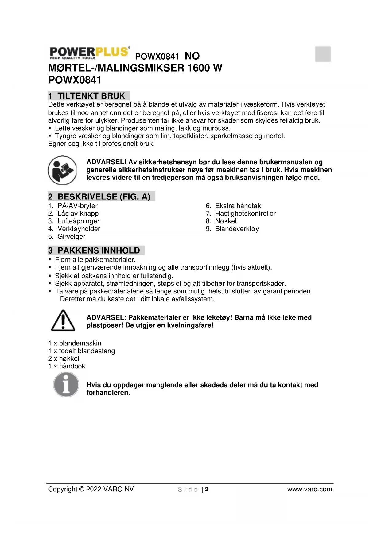 - Verktøyet egner seg ikke til å blande matvarer. Verktøyet kan ikke gjøres godt nok rent til å oppfylle kravene til hygiene.POWX0841 NO Copyright © 2022 VARO NV S i d e | 5 www.varo.com 7 BRUK