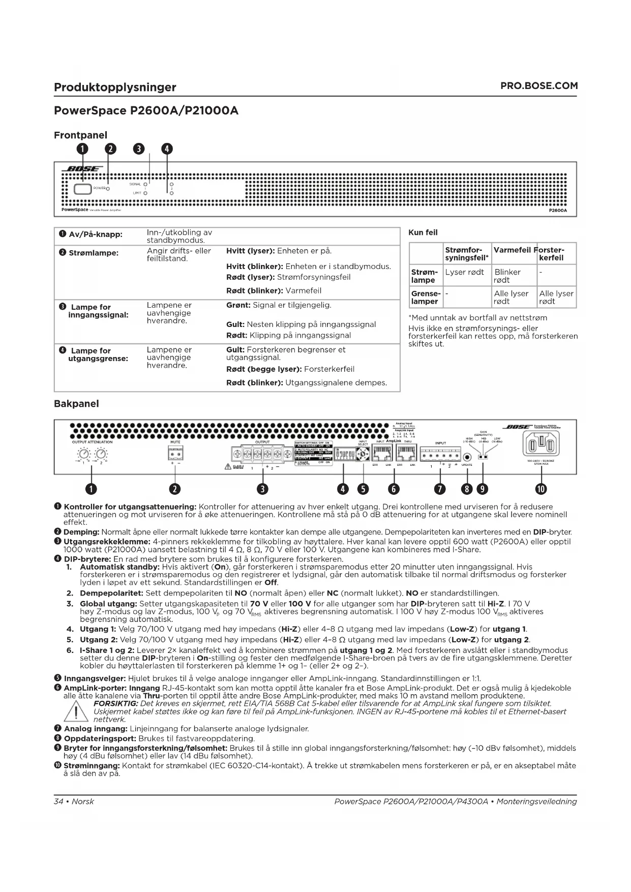 For ytterligere tekniak informasjon, inkludert spesifikasjoner, koblingsskjemaer og data om strømtrekk, kan du gå til siden for PowerSpaceprodukter pa PRO.BOSE.COM.