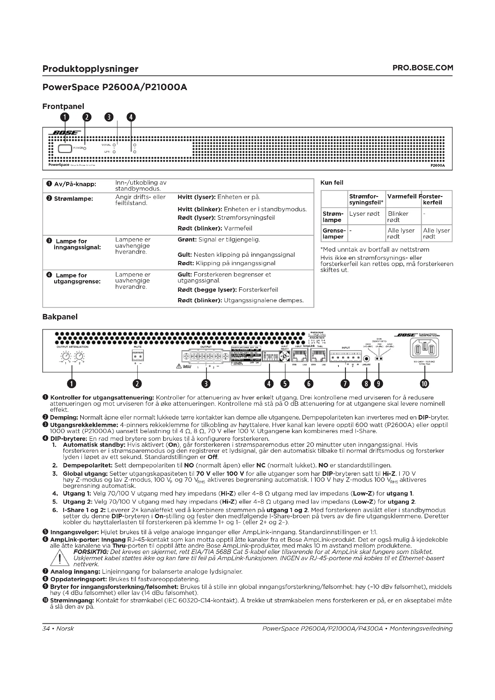 14. Henvis alt vedlikehold til kvalifisert personell. Apparatet trenger service når det er skadet, for eksempel når ledningen eller kontakten til strømforsyningen er skadet, det er sølt væske på apparatet eller gjenstander har falt inn i det, apparatet har blitt utsatt for regn eller fuktighet, det fungerer ikke slik det skal eller det har falt i bakken. Informasjon om forskrifter CAN ICES-3 (A)/NMB-3(A) Denne enheten er i samsvar med del 15 av FCC-reglementet og med bransjelisensen til Canada – unntatt RSS-standard(er). Bruk av enheten er underlagt følgende to betingelser: (1) Denne enheten kan ikke skape forstyrrende interferens, og (2) denne enheten må akseptere mottatt interferens, inkludert interferens som kan føre til uønsket drift. MERKNAD: Dette utstyret er testet og funnet å være innenfor grensene for en digital klasseA-enhet, i henhold til del15 av FCC-reglementet. Disse grensene skal gi rimelig beskyttelse mot skadelige forstyrrelser når utstyret brukes i et kommersielt miljø. Dette utstyret genererer, bruker og kan utstråle radiofrekvensenergi, og hvis det ikke monteres og brukes i samsvar med bruksanvisningen, kan det forårsake skadelige forstyrrelser på radiokommunikasjon. Bruk av dette utstyret i et boligområde vil sannsynligvis forårsake skadelige forstyrrelser. I slike tilfeller vil brukeren bli pålagt å utbedre forstyrrelsene for egen regning. Endringer eller modifiseringer som ikke er uttrykkelig godkjent av Bose Corporation, kan føre til at brukeren mister retten til å bruke dette utstyret. ADVARSEL: Dette er et klasseA-produkt. I et boligområde kan dette produktet forårsake radioforstyrrelser. I slike tilfeller kan brukeren bli pålagt å iverksette tilstrekkelige tiltak. Skjermede kabler er påkrevd for å være i samsvar med forskrifter. Dette produktet oppfyller alle EN55103-2 immunitetskrav for E2 elektromagnetisk miljø. Innkoblingsstrøm når produktet slås på: P21000A: 13,7A (230VAC 50Hz), 7,6A (120VAC 50Hz) P4300A/P2600A: 14,4A (230VAC 50Hz), 7,6A (120VAC 50Hz) Innkoblingsstrøm etter fem sekunders frakobling fra nettstrøm: P21000A: 8,2A (230VAC 50Hz), 5,4A (120VAC 50Hz) P4300A/P2600A: 9,6A (230VAC 50Hz), 6,1A (120VAC 50Hz) Produktet overholder alle kravene i gjeldende EU-direktiver. Du finner den fullstendige samsvarserklæringen på: www.Bose.com/compliance Dette produktet er i samsvar med alle gjeldende bestemmelser om elektromagnetisk kompatibilitet for 2016 og alle andre gjeldende bestemmelser i Storbritannia. Den fullstendige samsvarserklæringen finner du på www.Bose.com/compliancewww.Bose.com/compliance Dette symbolet betyr at produktet ikke må kasseres som husholdningsavfall, og at det skal leveres til en passende innsamlingsanlegg for gjenvinning. Riktig håndtering og gjenvinning bidrar til å beskytte naturressurser, helse og miljø. Hvis du vil ha mer informasjon om avfallshåndtering og resirkulering av dette produktet, kontakter du de lokale myndighetene, avfallsorganisasjonen eller butikken hvor du kjøpte dette produktet. Produksjonsdato: Det åttende tallet i serienummeret viser produksjonsåret: 7 er 2007 eller 2017. Importør for Kina: Bose Electronics (Shanghai) Company Limited, Level 6, Tower D, No. 2337 Gudai Rd. Minhang District, Shanghai 201100 Importør for Storbritannia: Bose Limited, Bose House, Quayside Chatham Maritime, Chatham, Kent, ME4 4QZ, Storbritannia Importør i EU: Bose Products B.V., Gorslaan 60, 1441 RG Purmerend, Nederland Importør i Mexico: Bose de México, S. de R.L. de C.V. , Paseo de las Palmas 405-204, Lomas de Chapultepec, 11000 México, D.F. For informasjon om importør og service: +5255 (5202) 3545 Importør i Taiwan: Bose Taiwan Branch, 9F-A1, No. 10, Section 3, Minsheng East Road, Taipei City 104, Taiwan. Telefonnummer: +886-2-2514 7676 Bose og PowerSpace er varemerker som tilhører Bose Corporation. Hovedkontoret til Bose Corporation: 1-877-230-5639 ©2022 Bose Corporation. Ingen del av dette arbeidet kan bli reprodusert, endret, distribuert eller på annen måte brukt uten skriftlig tillatelse på forhånd. Garantiinformasjon Dette produktet er dekket av en begrenset garanti. Hvis du vil ha informasjon om garanti, går du til PRO.BOSE.COM. ADVARSLER/FORHOLDSREGLER Inneholder små deler som kan utgjøre en kvelningsfare. Ikke egnet for barn under 3 år. Må ikke brukes i høyder over 2000 meter.