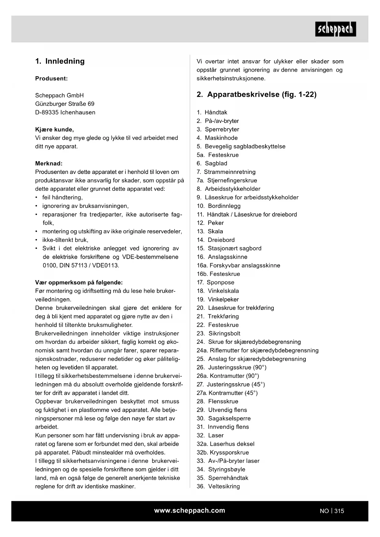 - Svikt i det elektriske anlegget ved ignorering av de elektriske forskriftene og VDE-bestemmelsene 0100, DIN 57113 / VDE0113. Vær oppmerksom på følgende: Før montering og idriftsetting må du lese hele bruker- veiledningen. Denne brukerveiledningen skal gjøre det enklere for deg å bli kjent med apparatet og gjøre nytte av den i henhold til tiltenkte bruksmuligheter. Brukerveiledningen inneholder viktige instruksjoner om hvordan du arbeider sikkert, faglig korrekt og øko- nomisk samt hvordan du unngår farer, sparer repara- sjonskostnader, reduserer nedetider og øker pålitelig- heten og levetiden til apparatet. I tillegg til sikkerhetsbestemmelsene i denne brukervei- ledningen må du absolutt overholde gjeldende forskrif- ter for drift av apparatet i landet ditt. Oppbevar brukerveiledningen beskyttet mot smuss og fuktighet i en plastlomme ved apparatet. Alle betje- ningspersoner må lese og følge den nøye før start av arbeidet. Kun personer som har fått undervisning i bruk av appa- ratet og farene som er forbundet med den, skal arbeide på apparatet. Påbudt minstealder må overholdes. I tillegg til sikkerhetsanvisningene i denne brukervei- ledningen og de spesielle forskriftene som gjelder i ditt land, må en også følge de generelt anerkjente tekniske reglene for drift av identiske maskiner.www.scheppach.com