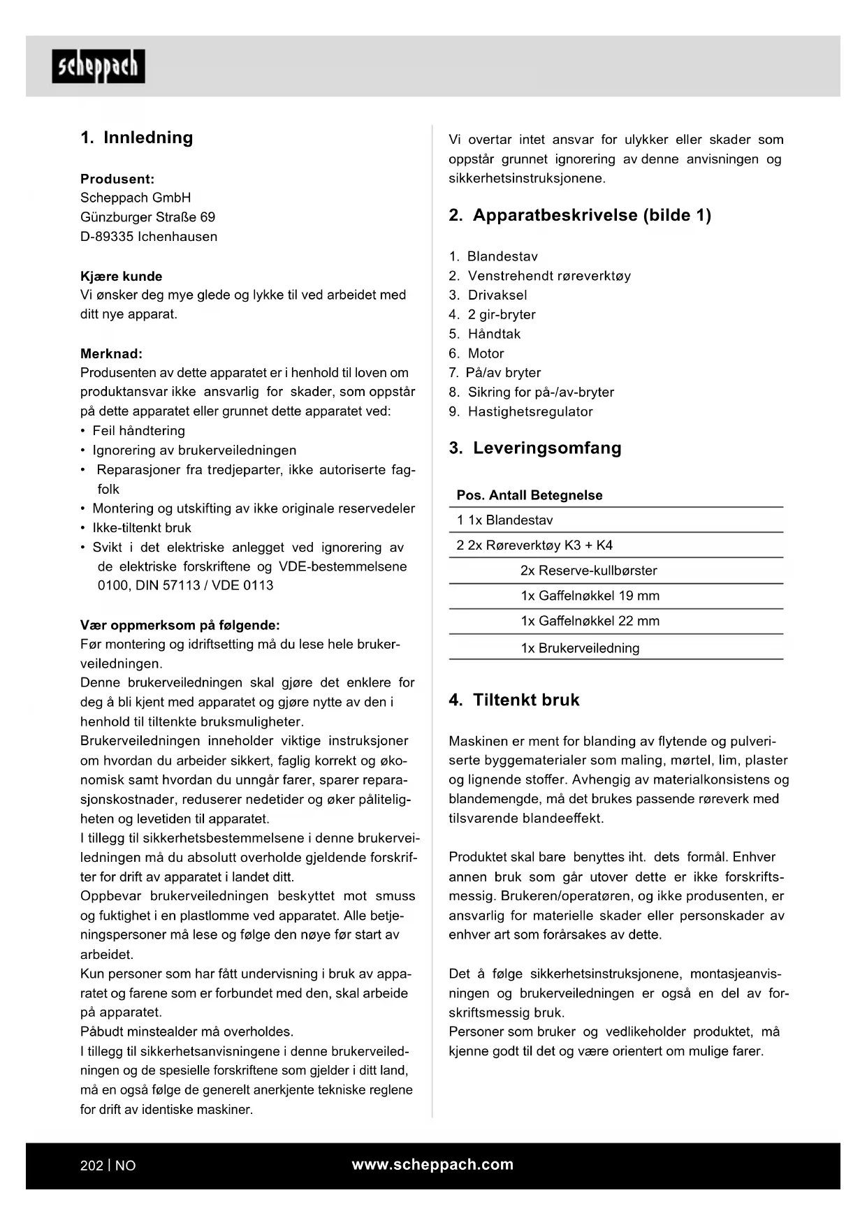 - Svikt i det elektriske anlegget ved ignorering av de elektriske forskriftene og VDE-bestemmelsene 0100, DIN 57113 / VDE 0113 Vær oppmerksom på følgende: Før montering og idriftsetting må du lese hele bruker- veiledningen. Denne brukerveiledningen skal gjøre det enklere for deg å bli kjent med apparatet og gjøre nytte av den i henhold til tiltenkte bruksmuligheter. Brukerveiledningen inneholder viktige instruksjoner om hvordan du arbeider sikkert, faglig korrekt og øko- nomisk samt hvordan du unngår farer, sparer repara- sjonskostnader, reduserer nedetider og øker pålitelig- heten og levetiden til apparatet. I tillegg til sikkerhetsbestemmelsene i denne brukervei- ledningen må du absolutt overholde gjeldende forskrif- ter for drift av apparatet i landet ditt. Oppbevar brukerveiledningen beskyttet mot smuss og fuktighet i en plastlomme ved apparatet. Alle betje- ningspersoner må lese og følge den nøye før start av arbeidet. Kun personer som har fått undervisning i bruk av appa- ratet og farene som er forbundet med den, skal arbeide på apparatet. Påbudt minstealder må overholdes. I tillegg til sikkerhetsanvisningene i denne brukerveiled- ningen og de spesielle forskriftene som gjelder i ditt land, må en også følge de generelt anerkjente tekniske reglene for drift av identiske maskiner.www.scheppach.com