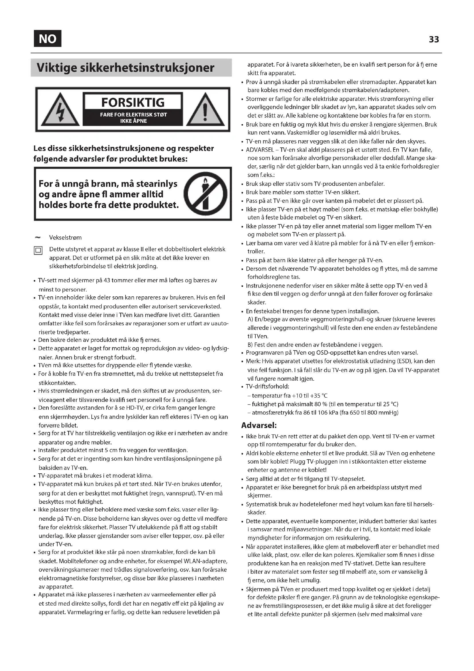 - ADVARSEL – TV-en skal aldri plasseres på et ustøtt sted. En TV kan falle, noe som kan forårsake alvorlige personskader eller dødsfall. Mange ska- der, særlig når det gjelder barn, kan unngås ved å ta enkle forholdsregler som f.eks.: