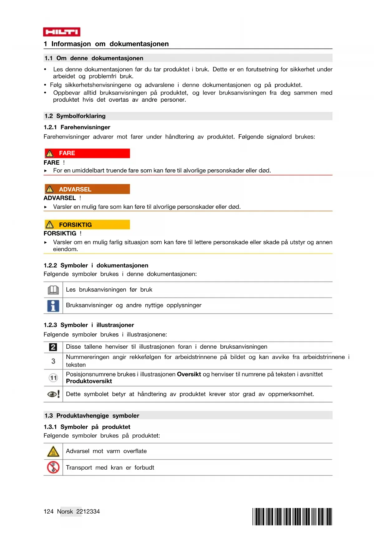 Følgende symboler brukes på produktet: Advarsel mot varm overflate Transport med kran er forbudt*2212334* 2212334 Norsk 125