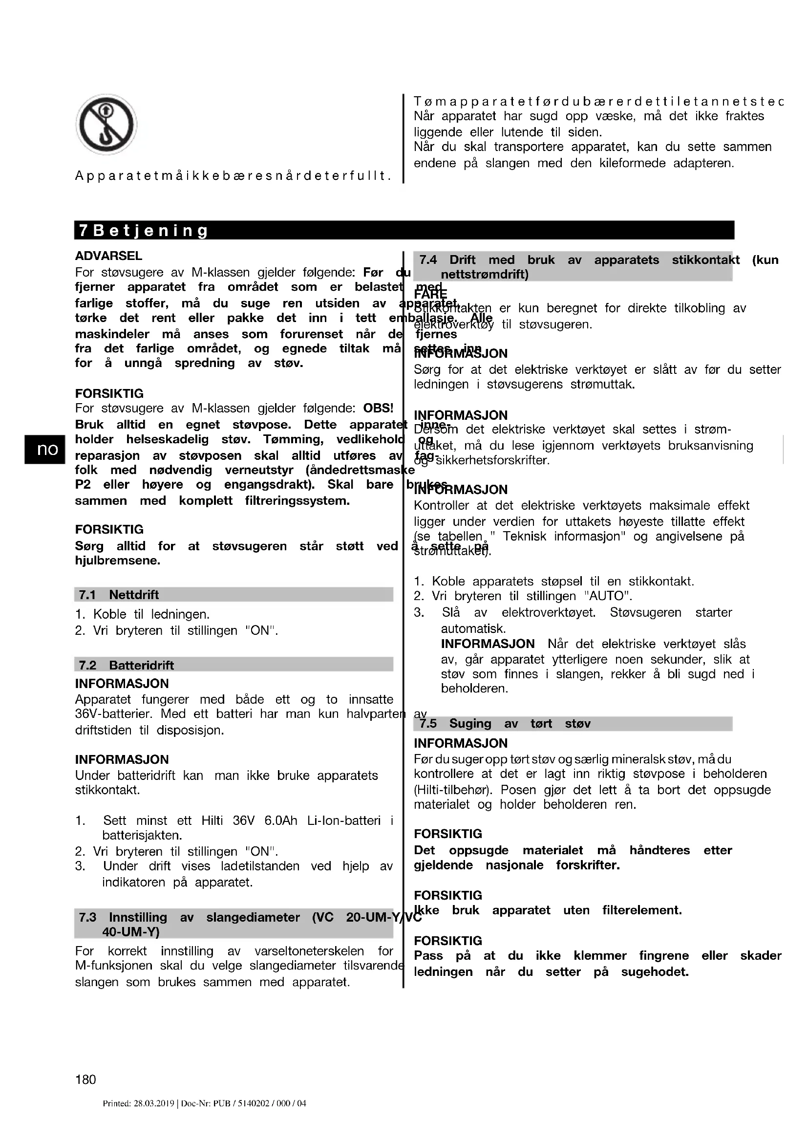Apparatet er en universalstøvsuger til industribruk, med et effektivt selvrensende filtersystem for tørt støv. Den kan brukes til både tørr- og våtsuging. Apparatet kan brukes med både nettstrøm og uavhengig av strømnettet med Hilti 36V Li‑Ion batterier. Ved nettstrømdrift kan apparatet samtidig brukes som universell ladestasjon for alle Hilti Li‑Ion-batterier (14V/22V/36V). Ved bruk av adapterplate og skyvebøyle (tilbehør) kan sugeren brukes som transportvogn for opp til tre Hilti verktøykofferter. Apparatet egner seg til oppsuging av mineralsk boreslam ved våtsuging i kombinasjon med Hilti diamantborekroner eller Hilti diamantsager og til oppsuging av store mengder mineralstøv ved tørrsuging i kombinasjon med Hilti diamantslipere, vinkelslipere, borehammere og tørrborekroner. Apparatene VC 20‑UM‑Y og VC 40‑UM‑Y egner seg for oppsuging og som avsug for tørt, ikke brennbart støv, væsker, trespon, kvartsholdig mineralstøv og farlig støv med eksplosjonsgrenseverdier (f.eks. MAK‑ eller AGW‑verdier) ≧0,1 mg/m³ (støvklasse M ifølge IEC/EN 60335-2-69). Må ikke brukes til oppsuging av andre helseskadelige stoffer. Olje og væsker med en temperatur på mer enn 60 °C må ikke suges opp. Ved oppsuging av støv med grenseverdier for eksponering må det foreligge en tilstrekkelig luftutskiftningsrate i rommet dersom luftutløpet fra apparatet fører tilbake i rommet (følg gjeldende nasjonale forskrifter). Maskinen må ikke brukes til oppsuging av eksplosjonsfarlige stoffer, glødende eller brennende hhv. brennbare (unntak: trespon) og aggressive støvtyper (eksempelvis magnesium‑aluminiumstøv osv.) og væsker (eksempelvis bensin, løsemidler, syrer, kjøle- og smøremidler osv.). Apparatetmåikkekjøres når det ligger nede. Apparatet må ikke veie mer enn 80 kg med last inkl. oppsugd materiale. Ikke klatre på apparatet.