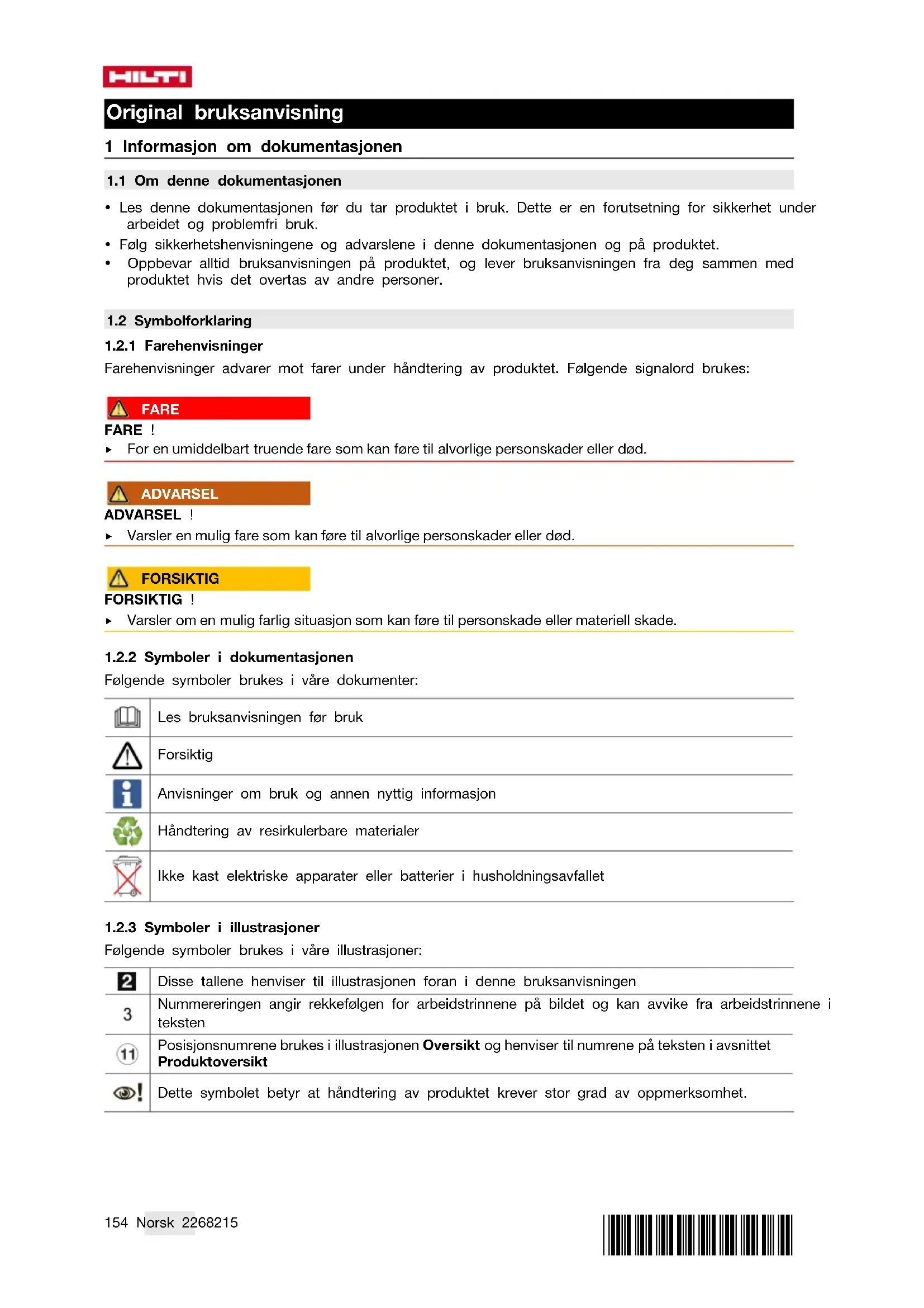 Følgende symboler brukes i våre illustrasjoner: Disse tallene henviser til illustrasjonen foran i denne bruksanvisningen Nummereringen angir rekkefølgen for arbeidstrinnene på bildet og kan avvike fra arbeidstrinnene i teksten Posisjonsnumrene brukes i illustrasjonen Oversikt og henviser til numrene på teksten i avsnittet Produktoversikt Dette symbolet betyr at håndtering av produktet krever stor grad av oppmerksomhet.*2268215* 2268215 Norsk 155