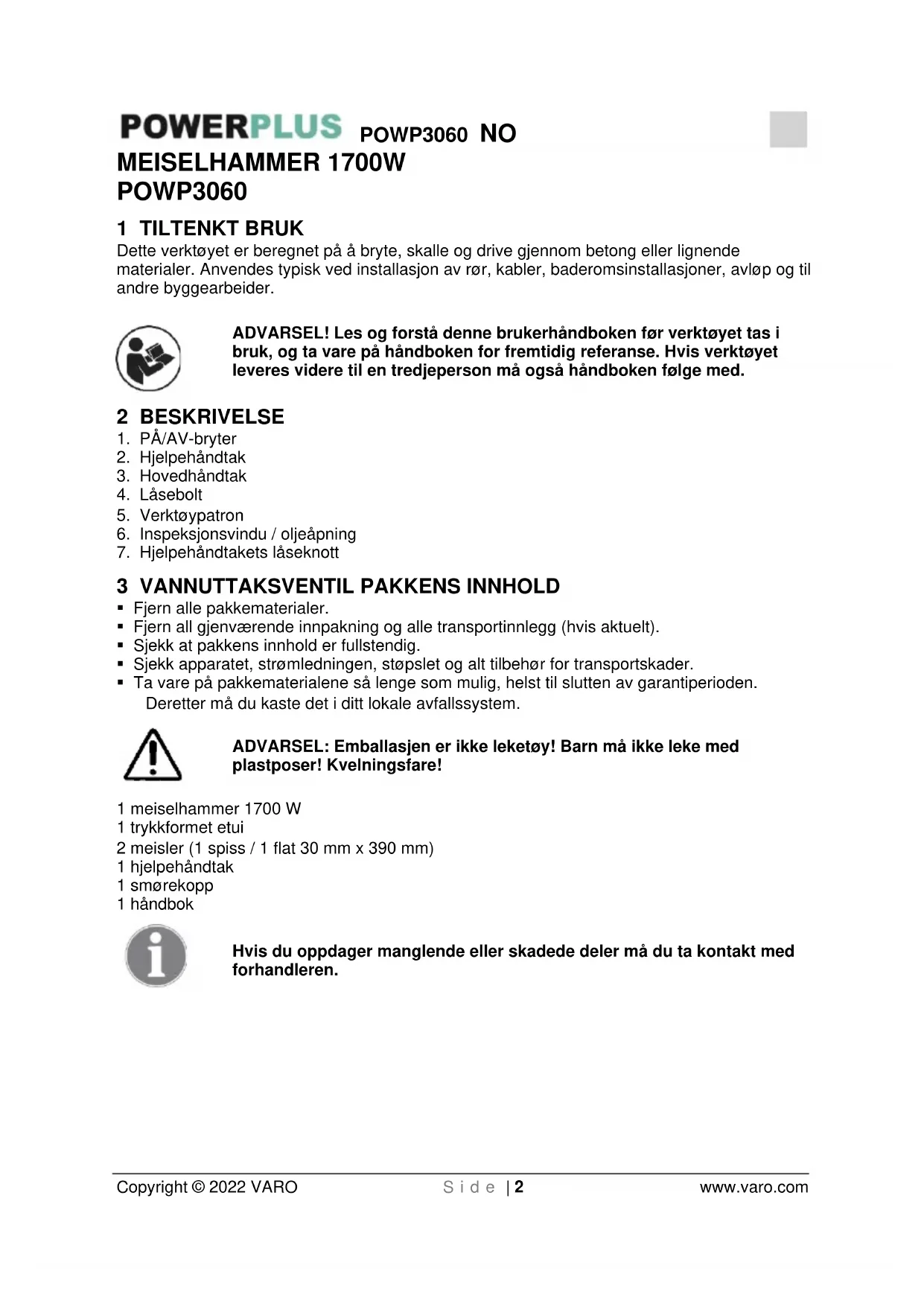 Copyright © 2022 VARO S i d e | 2 www.varo.com MEISELHAMMER 1700W POWP3060 1 TILTENKT BRUK Dette verktøyet er beregnet på å bryte, skalle og drive gjennom betong eller lignende materialer. Anvendes typisk ved installasjon av rør, kabler, baderomsinstallasjoner, avløp og til andre byggearbeider. ADVARSEL! Les og forstå denne brukerhåndboken før verktøyet tas i bruk, og ta vare på håndboken for fremtidig referanse. Hvis verktøyet leveres videre til en tredjeperson må også håndboken følge med. 2 BESKRIVELSE