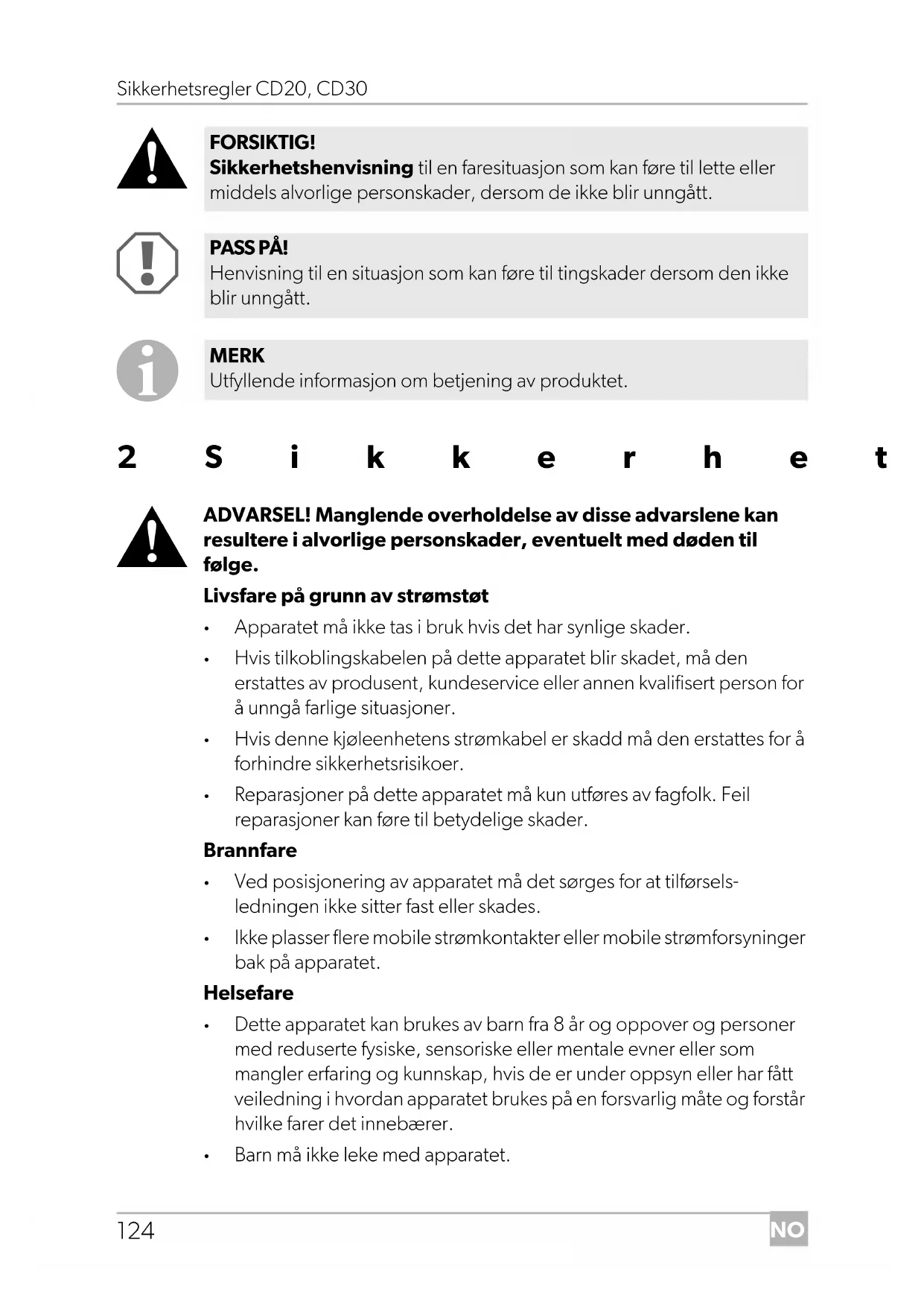 FORSIKTIG! Manglende overholdelse av disse forsiktighetsvars- lene kan resultere i mindre til moderate personskader. Livsfare på grunn av strømstøt