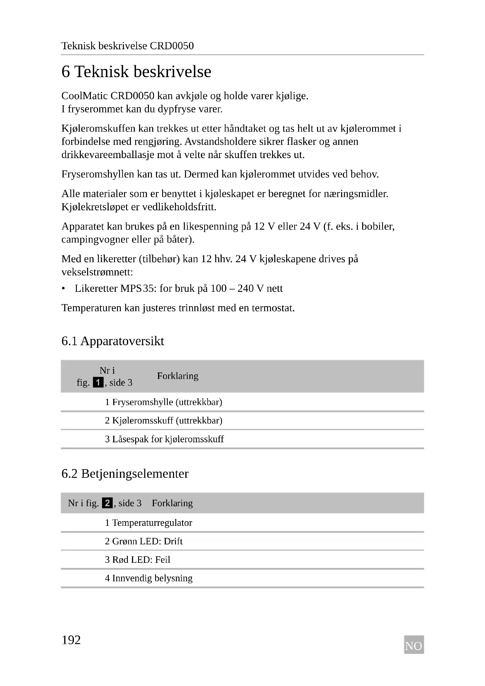 Kompressoren går ikke (tilkobling til vekselspenning) Kjølebelastningen øker, innetemperaturen stiger Uvanlig støy Feil Mulig årsak Løsning Ingen spenning Brudd i tilkoblingsledningen Opprett forbindelse Hovedbryteren er defekt (hvis en slik er montert) Bytt hovedbryter Ekstra ledningssikringer avbrent (i tilfelle dette er montert) Bytt ledningssikringer Det er spenning på, men kompressoren går ikke Omgivelsestemperaturen for høy – Utilstrekkelig ventilasjon Flytt kjøleskapet Kondensatoren er skitten Rengjør kondensatoren Elektrisk brudd i kompressoren mellom stiftene Kompressoren defekt Reparasjonen kan kun utføres av en godkjent kundeservicebedrift. Feil Mulig årsak Løsning Kompressoren går lenge/kontinuerlig Omgivelsestemperaturen for høy – Utilstrekkelig ventilasjon Flytt kjøleskapet Kondensatoren er skitten Rengjør kondensatoren Defekt vifte Bytt viften Kompressoren går sjelden Batteriene utslitt Lad batteri Feil Mulig årsak Løsning Høy brumming Komponenten til kjølekretsløpet kan ikke svinge fritt (ligger i veggen) Bøy komponenten forsiktig av Fremmedlegeme innklemt mellom kjølemaskin og vegg Fjern fremmedlegemer Viftestøy – CRD0050--IO-16s.book Seite 204 Mittwoch, 16. August 2017 10:30 10NO CRD0050 Tekniske data