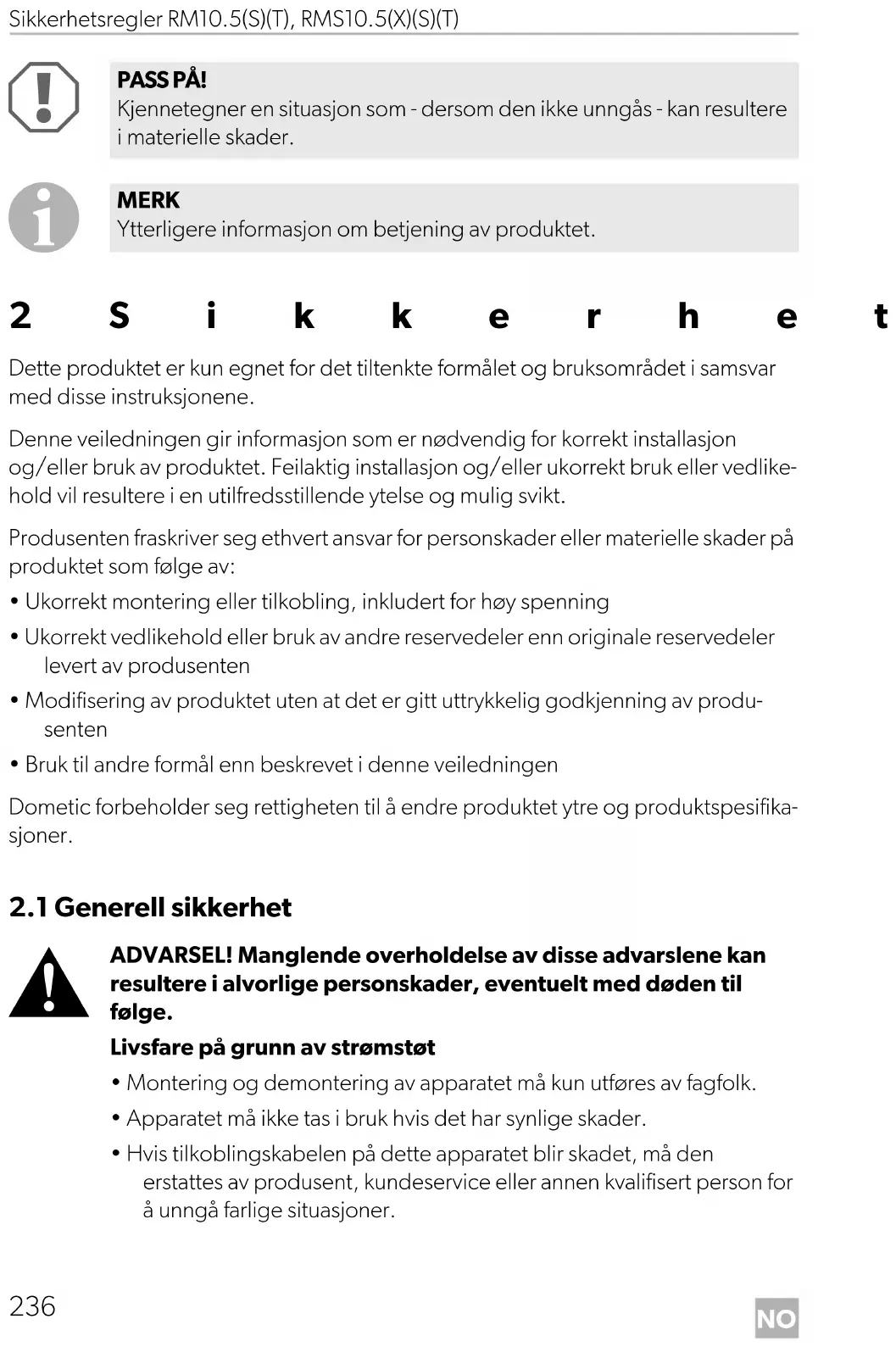 - Hvis tilkoblingskabelen på dette apparatet blir skadet, må den erstattes av produsent, kundeservice eller annen kvalifisert person for å unngå farlige situasjoner. PASS PÅ! Kjennetegner en situasjon som - dersom den ikke unngås - kan resultere i materielle skader. MERK Ytterligere informasjon om betjening av produktet.NO RM10.5(S)(T), RMS10.5(X)(S)(T) Sikkerhetsregler