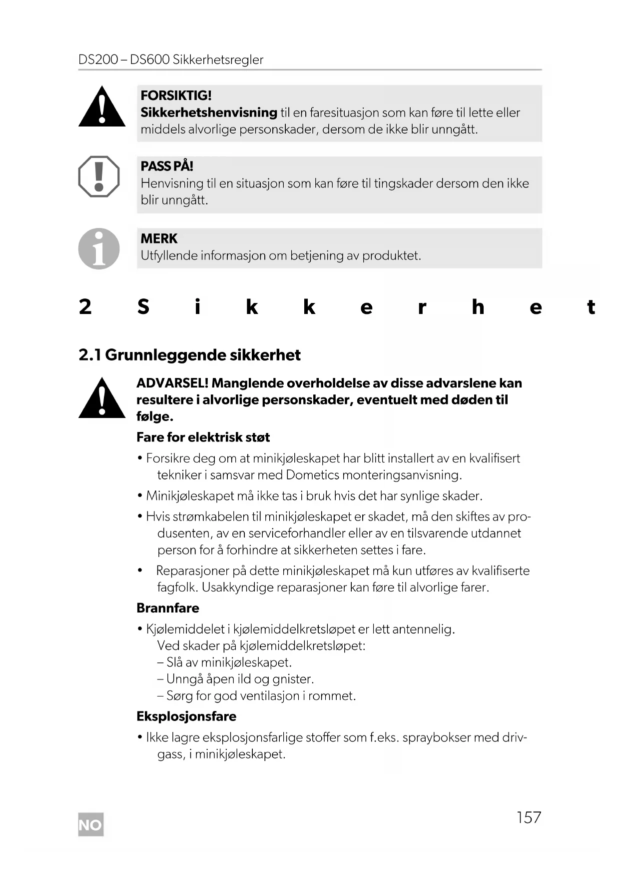 - Årsak til reklamasjonen eller beskrivelse av feilen Ingen kjøling, absor- berenheten er varm Kjøleskapet står ikke vannrett Rett opp kjøleskapet ved hjelp av et vater. Kjøleskapet ble slått på nylig Sjekk kjølingen igjen etter 5 til 6timer. Kjøleenheten defekt Autorisert serviceforhandler: Skift ut kjøleskapet. Dårlig kjøleeffekt Kjøleskapet er utsatt for direkte sollys Ta kjøleskapet ut av sollyset. Døren på kjøleskapet lukker ikke med omsluttende tetning Sjekk klaringene (fig. 5, side 7). Autorisert serviceforhandler: Skift ut dørtetningen. Kjøleskapet ble nylig fylt opp Sjekk kjølingen igjen etter 5 til 6timer. Frostdannelse inne i kjøleskapet Døren på kjøleskapet lukker ikke med omsluttende tetning Sjekk klaringene (fig. 5, side 7) Autorisert serviceforhandler: Skift ut dørtetningen Kjøler ikke, den inn- vendige lampen blin- ker Kjøleskapet overbelastet ➤ Frakoble apparatet fra strømfor- syningen for minst 10 sekunder. ➤ Koble til apparatet Dette nullstiller elektronikken og apparatet bør da gjenoppta normal drift. Hvis LED starter å blinke igjen, har det oppstått en alvorlig feil: ➤ Ta kontakt med et autorisert verksted. Døren er ikke riktig lukket Utilstrekkelig luftsirkulasjon for kjøleenheten Kjøleskapet står ikke vannrett Problem Mulig årsak Løsning DometicDS200-300-400-600_IOM_4445103315_EMEA16_2020-xx-xx.book Seite 168 Mittwoch, 3. März 2021 11:36 11NO DS200 – DS600 Avfallsbehandling