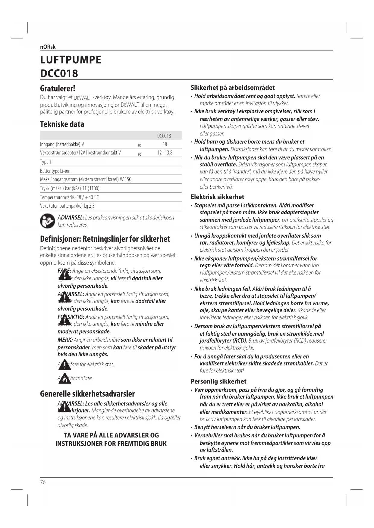 DeWALT 13,8V ekstern strømtilførsel for å blåse luft i bil- og sykkeldekk, baller, gummibåter, luftmadrasser og flytemadrasser etc. Dette produktet er kun tiltenkt profesjonellbruk.82 NORSK IKKE bruk når det er vått eller i nærheten av antennelige væsker ellergasser. IKKE bruk luftpumpen i områder somspraymales. Denne luftpumpen er et profesjonelt elektroverktøy. IKKE la barn komme i kontakt med verktøyet. Uerfarne operatører trenger tilsyn når de bruker detteverktøyet.