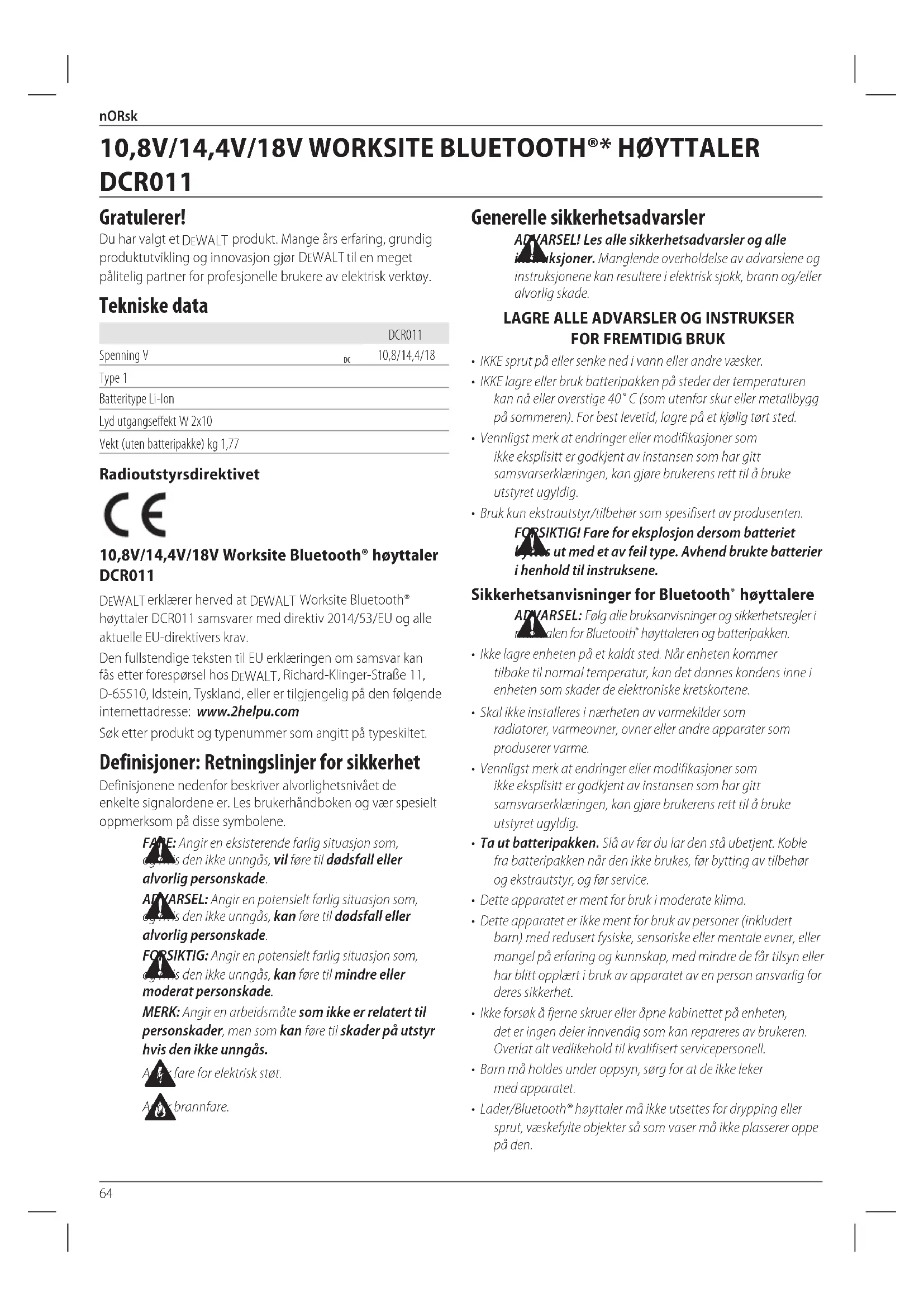- Lader/Bluetooth® høyttaler må ikke utsettes for drypping eller sprut, væskefylte objekter så som vaser må ikke plasserer oppe påden. Gratulerer! Du har valgt et DeWALT produkt. Mange års erfaring, grundig produktutvikling og innovasjon gjør DeWALT til en meget pålitelig partner for profesjonelle brukere av elektriskverktøy. Tekniske data DCR011 Spenning V