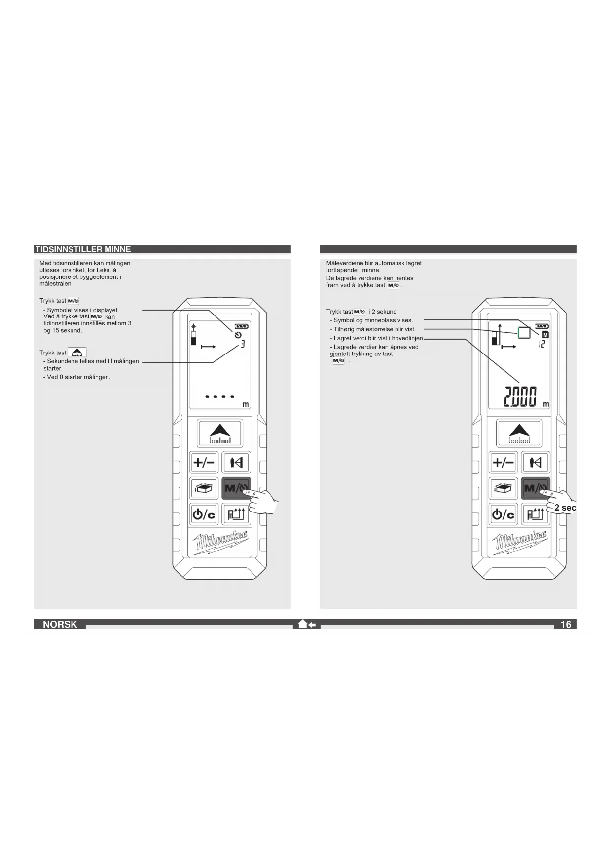 2 sec NORSK TIDSINNSTILLER MINNE Med tidsinnstilleren kan målingen utløses forsinket, for f.eks. å posisjonere et byggeelement i målestrålen. Trykk tast - Symbolet vises i displayet Ved å trykke tast kan tidinnstilleren innstilles mellom 3 og 15 sekund. Trykk tast - Sekundene telles ned til målingen starter. - Ved 0 starter målingen. Måleverdiene blir automatisk lagret fortløpende i minne. De lagrede verdiene kan hentes fram ved å trykke tast