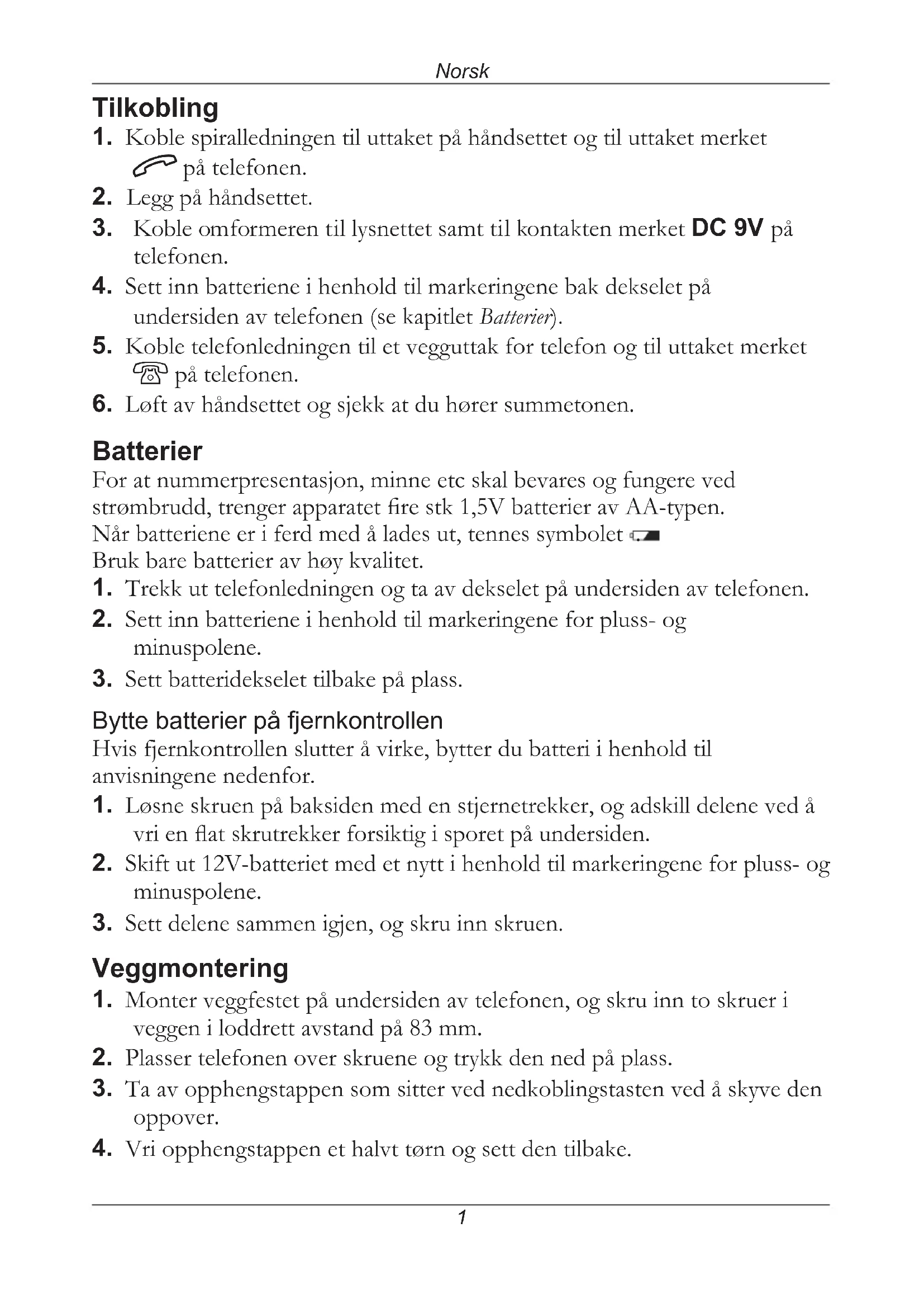 Batterier For at nummerpresentasjon, minne etc skal bevares og fungere ved strømbrudd, trenger apparatet re stk 1,5V batterier av AA-typen. Når batteriene er i ferd med å lades ut, tennes symbolet . Bruk bare batterier av høy kvalitet.
