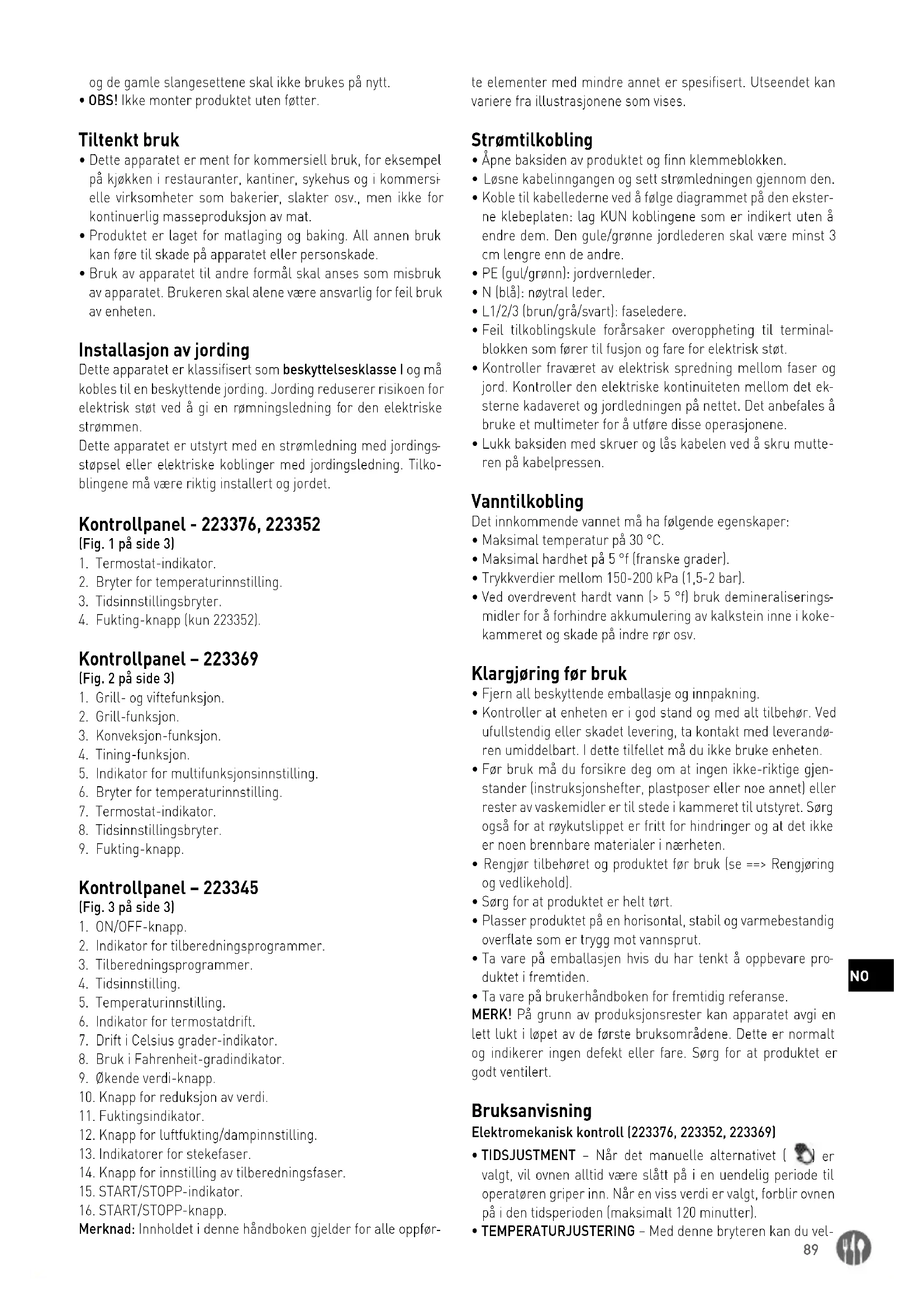 - Ta vare på brukerhåndboken for fremtidig referanse. MERK! På grunn av produksjonsrester kan apparatet avgi en lett lukt i løpet av de første bruksområdene. Dette er normalt og indikerer ingen defekt eller fare. Sørg for at produktet er godt ventilert. Bruksanvisning Elektromekanisk kontroll (223376, 223352, 223369)