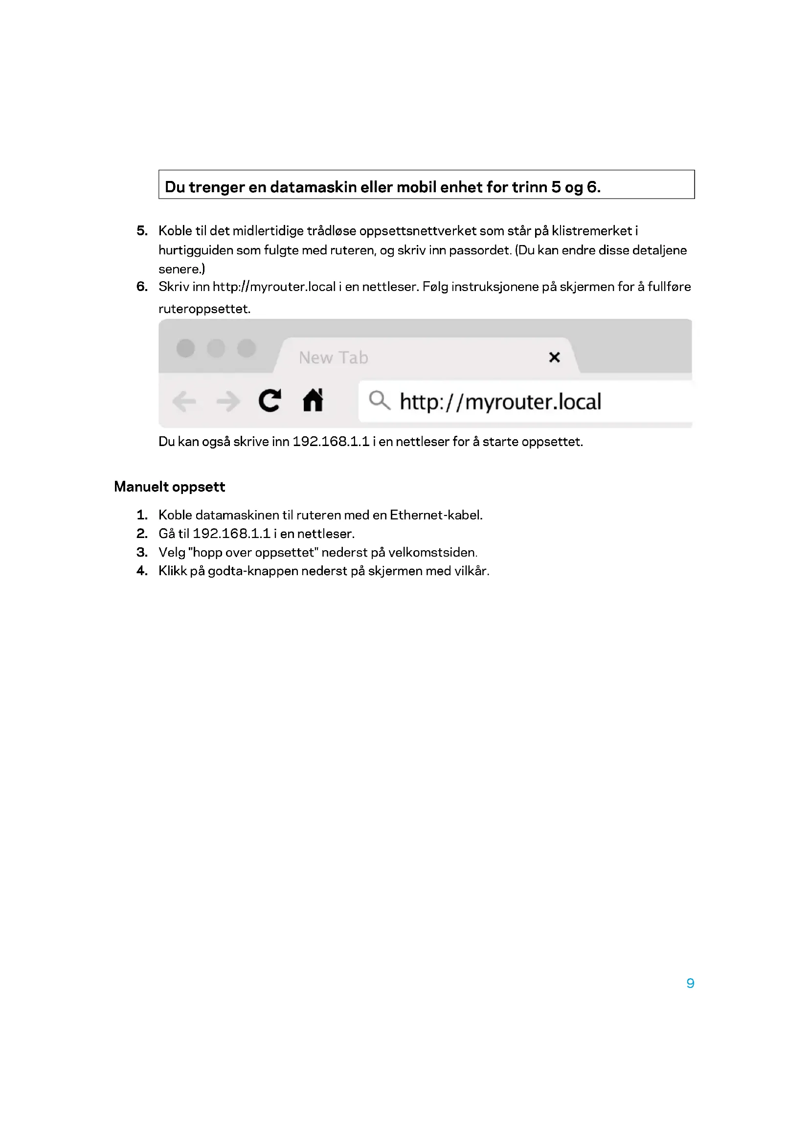 ruteroppsettet. Du kan også skrive inn 192.168.1.1 i en nettleser for å starte oppsettet. Manuelt oppsett