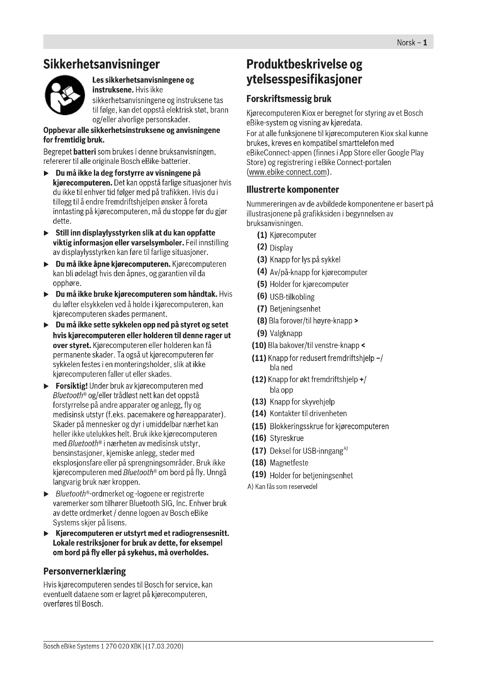 IP x7 Vekt, ca. g 60 Bluetooth®Low Energy – Frekvens MHz 2400–2480 – Sendeeffekt mW <10 A) ved omgivelsestemperatur <25 °C B) Inngår ikke i standardleveransen C) ved lukket USB-deksel Samsvarserklæring Robert Bosch GmbH, Bosch eBike Systems, erklærer herved at radioutstyrstypen Kiox er i samsvar med direktivet 2014/53/EU. Den fullstendige teksten i EU- samsvarserklæringen finnes på følgende nettadresse: https://www.ebike-connect.com/conformity. Montering Sette inn og ta ut kjørecomputeren (se bildeA) Sett først den nedre delen av Kiox på holderen (5), og fell den litt frem til det merkes at kjørecomputeren festes i magnetholderen. For å ta den ut holder du oppe på kjørecomputeren og trekker den mot deg til den løsner fra magnetholderen. u Ta av kjørecomputeren når du parkerer din eBike. Det er mulig å feste kjørecomputeren slik at den ikke kan tas ut av holderen. Løsne styreskruen(16) helt til holderen til Kiox kan svinges ut på siden. Sett kjørecomputeren i holderen. Skru inn blokkeringsskruen (M3, 6 mm lang) i gjengene til kjørecomputeren fra undersiden (bruk av en lengre skrue kan føre til skade på kjørecomputeren). Sving holderen tilbake igjen, og stram styreskruen som angitt av produsenten. Bruk Før første gangs bruk Kiox leveres med delvis ladet batteri. Før første gangs bruk må dette batteriet lades i minst 1 time via USB-inngangen (se „Kjørecomputerens strømforsyning“, SideNorsk – 3) eller via eBike-systemet. Betjeningsenheten bør være plassert slik at knappene nesten står loddrett mot styret. Ved første gangs bruk vises først språkvalget, og deretter kan du få en forklaring av viktige funksjoner og visninger via menypunktet <Intro to Kiox (Innføring i Kiox)>. Menypunktet kan også hentes frem senere via <Settings (Innstillinger)>→ <Information (Informasjon)>. Velge systeminnstillinger Sett kjørecomputeren i holderen, og følg fremgangsmåten under. Sykkelen skal stå stille: Gå til statusskjermbildet (gå til den første visningen med knappen <(10) på betjeningsenheten), og åpne <Settings (Innstillinger)> med valgknappen. Med knappene –(11) og +(12) kan du velge ønsket innstilling og åpne denne og eventuelle undermenyer med valgknappen (9). Fra den aktuelle innstillingsmenyen kan du bla tilbake til den forrige menyen med knappen<(10). I <Sys settings (Systeminnstillinger)> kan du foreta følgende innstillinger: – <Brightness (Lysstyrke)> – <Time (Tid)> – <Date [DD.Mon.YYYY] (Dato [DD.MND.ÅÅÅÅ])> – <Time zone (Tidssone)> – <24h form (24-timersformat)> – <Brgh backg. (Lys bakgrunn)> – <Imp. units (Britiske enheter)> – <Language (Språk)> – <Factory reset (Tilbakestilling til fabrikkinnstillinger)> Ta eBike-systemet i bruk Forutsetninger eBike-systemet kan bare aktiveres når følgende forutsetninger er oppfylt: – Det er satt inn et tilstrekkelig ladet eBike-batteri (se bruksanvisningen for batteriet). – Kjørecomputeren sitter riktig i holderen. Slå eBike-systemet på/av Du slår på eBike-systemet på følgende måter: – Trykk kort én gang på av/på-knappen (4) til kjørecomputeren med kjørecomputeren og eBike- batteriet satt inn. – Trykk på av/på-knappen til eBike-batteriet hvis kjørecomputeren er satt inn (enkelte sykkelprodusenter har løsninger der det ikke er tilgang til av/på-knappen til batteriet, se bruksanvisningen fra sykkelprodusenten). Motoren aktiveres så snart du trår på pedalene (unntatt i funksjonen skyvehjelp eller i fremdriftshjelpnivået OFF). Motoreffekten avhenger av nivået på fremdriftshjelpen som er stilt inn på kjørecomputeren. Når du slutter å trå på pedalene i normalmodus, eller så snart sykkelen har kommet opp i en hastighet på 25/45km/h kobles hjelpen fra eBike-motoren ut. Motoren aktiveres 1 270 020 XBK | (17.03.2020) Bosch eBike SystemsNorsk – 3 automatisk igjen når du trår på pedalene og hastigheten er under 25/45 km/h. Du slår av eBike-systemet på følgende måter: – Trykk kort på av/på-knappen (4) til kjørecomputeren. – Slå av eBike-batteriet med av/på-knappen til dette (enkelte sykkelprodusenter har løsninger der det ikke er tilgang til av/på-knappen til batteriet, se bruksanvisningen fra sykkelprodusenten). – Ta kjørecomputeren ut av holderen. Hvis det ikke er behov for effekt fra eBike-motoren i løpet av ca. 10 minutter (for eksempel fordi sykkelen står i ro) og ingen knapp på kjørecomputeren eller betjeningsenheten til eBike trykkes, slås eBike-systemet og dermed også batteriet av automatisk, for å spare strøm. Kjørecomputerens strømforsyning Når kjørecomputeren sitter i holderen (5), et tilstrekkelig ladet eBike-batteri er satt på elsykkelen og eBike-systemet er slått på, får kjørecomputerbatteriet strøm fra eBike‑batteriet og lades. Hvis kjørecomputeren tas ut av holderen(5), skjer strømforsyningen via kjørecomputerbatteriet. Hvis kjørecomputerbatteriet er svakt, vises en varselmelding på displayet. Når du skal lade kjørecomputerbatteriet, setter du kjørecomputeren i holderen (5) igjen. Hvis du ikke lader eBike-batteriet på dette tidspunktet, slås eBike-systemet automatisk av etter 10minutter uten aktivering. Da avsluttes også ladingen av kjørecomputerbatteriet. Du kan også lade kjørecomputeren via USB-inngangen(6). Da åpner du beskyttelsesdekselet (17). Koble USB- kontakten til kjørecomputeren til en vanlig USB-lader (følger ikke med som standard) via en Micro-USB-kabel eller til USB-inngangen på en datamaskin (maks. 5V ladespenning; maks. 500mA ladestrøm). Hvis kjørecomputeren tas ut av holderen (5), forblir alle verdiene for funksjonene lagret, og de vises kontinuerlig. Uten ny lading av Kiox-batteriet beholdes dato og klokkeslett i maksimalt 6 måneder. Etter at den er slått på igjen blir dato og klokkeslett stilt inn på nytt på smarttelefonen ved Bluetooth®-forbindelse med appen og vellykket GPS- lokalisering. Merknad: Kiox lades bare når den er slått på. 