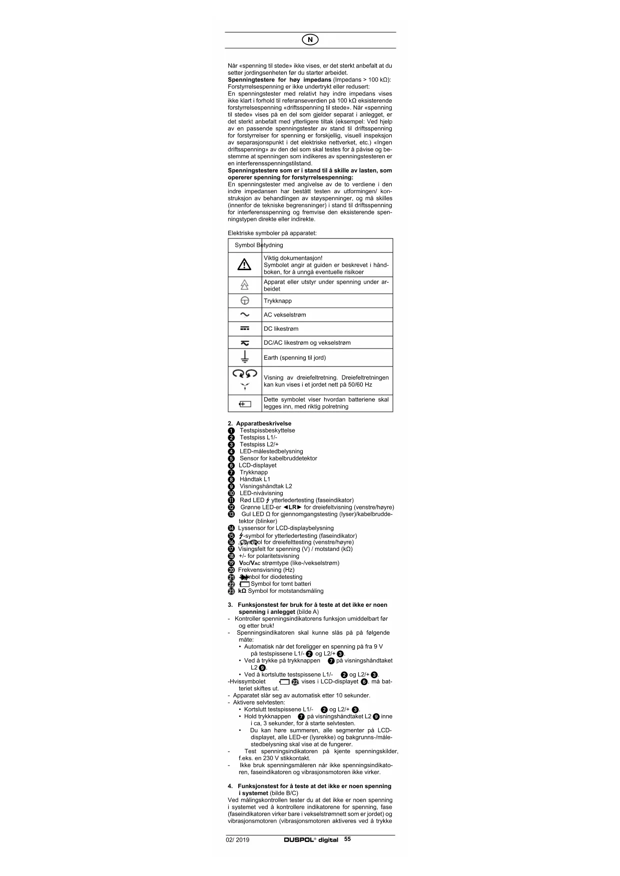 på test- spissen etter bruk av spenningsindikatoren, for å beskytte mot personskader! - Vær oppmerksom på påvirkende impedans (indre mot- stand) av spenningstesteren som viser interferensspen- ning (kapasitivt eller induktivt koplet)! Avhengig av den interne impedansen til spenningstesteren, nnes det i nærvær av støyspenning ulike alternativer som vi- ser «driftsspenning tilstede» eller «driftsspenning nnes ikke». Spenningstestere for lav impedans (Impedans < 100 kΩ), forstyrrelsespenning er undertrykt eller redusert: En spenningstester med forholdsvis lav indre impedans blir sammenlignet med referanseverdien 100 kΩ, og viser ikke alle støyspenninger med ett startverdi over ELV (50 V AC/ 120 V DC). Ved kontakt med de delene som skal testes kan spen- ningstesteren temporært redusere interferensspenning ved utladning til et nivå under ELV; etter fjernelse av spenningstes- tere vil interferensspenning anta dens opprinnelige verdi igjen.02/ 2019 DUSPOL