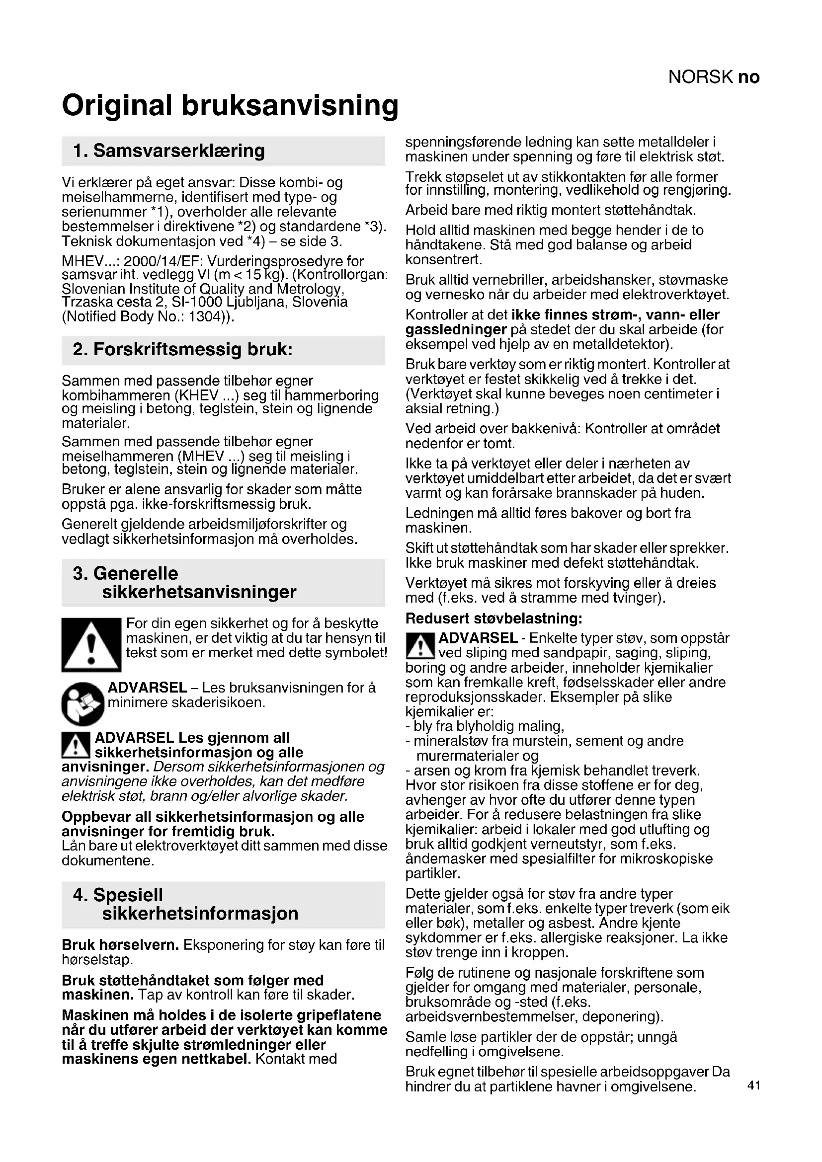 Original bruksanvisning Vi erklærer på eget ansvar: Disse kombi- og meiselhammerne, identifisert med type- og serienummer *1), overholder alle relevante bestemmelser i direktivene *2) og standardene *3). Teknisk dokumentasjon ved *4) – se side 3. MHEV...: 2000/14/EF: Vurderingsprosedyre for samsvar iht. vedlegg VI (m < 15 kg). (Kontrollorgan: Slovenian Institute of Quality and Metrology, Trzaska cesta 2, SI-1000 Ljubljana, Slovenia (Notified Body No.: 1304)). Sammen med passende tilbehør egner kombihammeren (KHEV ...) seg til hammerboring og meisling i betong, teglstein, stein og lignende materialer. Sammen med passende tilbehør egner meiselhammeren (MHEV ...) seg til meisling i betong, teglstein, stein og lignende materialer. Bruker er alene ansvarlig for skader som måtte oppstå pga. ikke-forskriftsmessig bruk. Generelt gjeldende arbeidsmiljøforskrifter og vedlagt sikkerhetsinformasjon må overholdes. For din egen sikkerhet og for å beskytte maskinen, er det viktig at du tar hensyn til tekst som er merket med dette symbolet! ADVARSEL – Les bruksanvisningen for å minimere skaderisikoen. ADVARSEL Les gjennom all sikkerhetsinformasjon og alle anvisninger. Dersom sikkerhetsinformasjonen og anvisningene ikke overholdes, kan det medføre elektrisk støt, brann og/eller alvorlige skader. Oppbevar all sikkerhetsinformasjon og alle anvisninger for fremtidig bruk. Lån bare ut elektroverktøyet ditt sammen med disse dokumentene. Bruk hørselvern. Eksponering for støy kan føre til hørselstap. Bruk støttehåndtaket som følger med maskinen. Tap av kontroll kan føre til skader. Maskinen må holdes i de isolerte gripeflatene når du utfører arbeid der verktøyet kan komme til å treffe skjulte strømledninger eller maskinens egen nettkabel. Kontakt med spenningsførende ledning kan sette metalldeler i maskinen under spenning og føre til elektrisk støt. Trekk støpselet ut av stikkontakten før alle former for innstilling, montering, vedlikehold og rengjøring. Arbeid bare med riktig montert støttehåndtak. Hold alltid maskinen med begge hender i de to håndtakene. Stå med god balanse og arbeid konsentrert. Bruk alltid vernebriller, arbeidshansker, støvmaske og vernesko når du arbeider med elektroverktøyet. Kontroller at det ikke finnes strøm-, vann- eller gassledninger på stedet der du skal arbeide (for eksempel ved hjelp av en metalldetektor). Bruk bare verktøy som er riktig montert. Kontroller at verktøyet er festet skikkelig ved å trekke i det. (Verktøyet skal kunne beveges noen centimeter i aksial retning.) Ved arbeid over bakkenivå: Kontroller at området nedenfor er tomt. Ikke ta på verktøyet eller deler i nærheten av verktøyet umiddelbart etter arbeidet, da det er svært varmt og kan forårsake brannskader på huden. Ledningen må alltid føres bakover og bort fra maskinen. Skift ut støttehåndtak som har skader eller sprekker. Ikke bruk maskiner med defekt støttehåndtak. Verktøyet må sikres mot forskyving eller å dreies med (f.eks. ved å stramme med tvinger). Redusert støvbelastning: ADVARSEL - Enkelte typer støv, som oppstår ved sliping med sandpapir, saging, sliping, boring og andre arbeider, inneholder kjemikalier som kan fremkalle kreft, fødselsskader eller andre reproduksjonsskader. Eksempler på slike kjemikalier er: - bly fra blyholdig maling, - mineralstøv fra murstein, sement og andre murermaterialer og - arsen og krom fra kjemisk behandlet treverk. Hvor stor risikoen fra disse stoffene er for deg, avhenger av hvor ofte du utfører denne typen arbeider. For å redusere belastningen fra slike kjemikalier: arbeid i lokaler med god utlufting og bruk alltid godkjent verneutstyr, som f.eks. åndemasker med spesialfilter for mikroskopiske partikler. Dette gjelder også for støv fra andre typer materialer, som f.eks. enkelte typer treverk (som eik eller bøk), metaller og asbest. Andre kjente sykdommer er f.eks. allergiske reaksjoner. La ikke støv trenge inn i kroppen. Følg de rutinene og nasjonale forskriftene som gjelder for omgang med materialer, personale, bruksområde og -sted (f.eks. arbeidsvernbestemmelser, deponering). Samle løse partikler der de oppstår; unngå nedfelling i omgivelsene. Bruk egnet tilbehør til spesielle arbeidsoppgaver Da hindrer du at partiklene havner i omgivelsene.