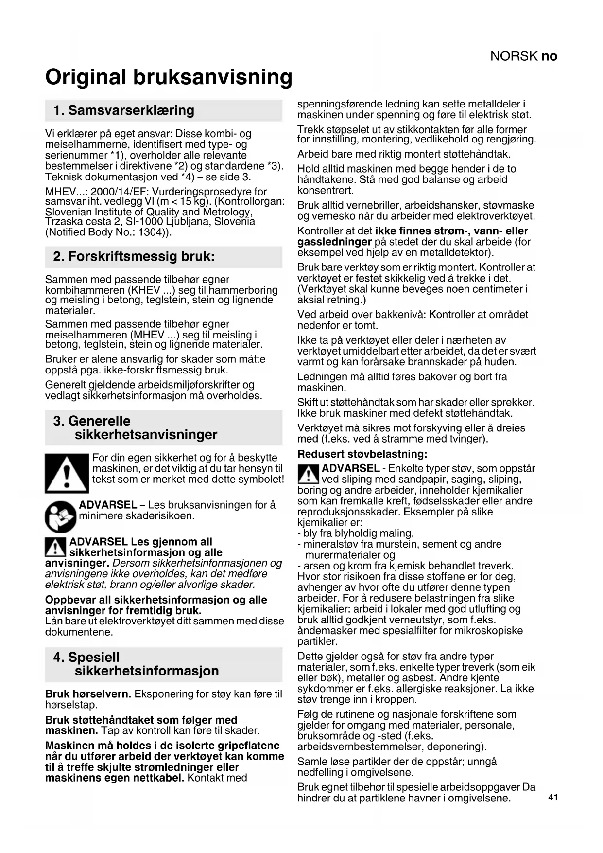 Original bruksanvisning Vi erklærer på eget ansvar: Disse kombi- og meiselhammerne, identifisert med type- og serienummer *1), overholder alle relevante bestemmelser i direktivene *2) og standardene *3). Teknisk dokumentasjon ved *4) – se side 3. MHEV...: 2000/14/EF: Vurderingsprosedyre for samsvar iht. vedlegg VI (m < 15 kg). (Kontrollorgan: Slovenian Institute of Quality and Metrology, Trzaska cesta 2, SI-1000 Ljubljana, Slovenia (Notified Body No.: 1304)). Sammen med passende tilbehør egner kombihammeren (KHEV ...) seg til hammerboring og meisling i betong, teglstein, stein og lignende materialer. Sammen med passende tilbehør egner meiselhammeren (MHEV ...) seg til meisling i betong, teglstein, stein og lignende materialer. Bruker er alene ansvarlig for skader som måtte oppstå pga. ikke-forskriftsmessig bruk. Generelt gjeldende arbeidsmiljøforskrifter og vedlagt sikkerhetsinformasjon må overholdes. For din egen sikkerhet og for å beskytte maskinen, er det viktig at du tar hensyn til tekst som er merket med dette symbolet! ADVARSEL – Les bruksanvisningen for å minimere skaderisikoen. ADVARSEL Les gjennom all sikkerhetsinformasjon og alle anvisninger. Dersom sikkerhetsinformasjonen og anvisningene ikke overholdes, kan det medføre elektrisk støt, brann og/eller alvorlige skader. Oppbevar all sikkerhetsinformasjon og alle anvisninger for fremtidig bruk. Lån bare ut elektroverktøyet ditt sammen med disse dokumentene. Bruk hørselvern. Eksponering for støy kan føre til hørselstap. Bruk støttehåndtaket som følger med maskinen. Tap av kontroll kan føre til skader. Maskinen må holdes i de isolerte gripeflatene når du utfører arbeid der verktøyet kan komme til å treffe skjulte strømledninger eller maskinens egen nettkabel. Kontakt med spenningsførende ledning kan sette metalldeler i maskinen under spenning og føre til elektrisk støt. Trekk støpselet ut av stikkontakten før alle former for innstilling, montering, vedlikehold og rengjøring. Arbeid bare med riktig montert støttehåndtak. Hold alltid maskinen med begge hender i de to håndtakene. Stå med god balanse og arbeid konsentrert. Bruk alltid vernebriller, arbeidshansker, støvmaske og vernesko når du arbeider med elektroverktøyet. Kontroller at det ikke finnes strøm-, vann- eller gassledninger på stedet der du skal arbeide (for eksempel ved hjelp av en metalldetektor). Bruk bare verktøy som er riktig montert. Kontroller at verktøyet er festet skikkelig ved å trekke i det. (Verktøyet skal kunne beveges noen centimeter i aksial retning.) Ved arbeid over bakkenivå: Kontroller at området nedenfor er tomt. Ikke ta på verktøyet eller deler i nærheten av verktøyet umiddelbart etter arbeidet, da det er svært varmt og kan forårsake brannskader på huden. Ledningen må alltid føres bakover og bort fra maskinen. Skift ut støttehåndtak som har skader eller sprekker. Ikke bruk maskiner med defekt støttehåndtak. Verktøyet må sikres mot forskyving eller å dreies med (f.eks. ved å stramme med tvinger). Redusert støvbelastning: ADVARSEL - Enkelte typer støv, som oppstår ved sliping med sandpapir, saging, sliping, boring og andre arbeider, inneholder kjemikalier som kan fremkalle kreft, fødselsskader eller andre reproduksjonsskader. Eksempler på slike kjemikalier er: - bly fra blyholdig maling, - mineralstøv fra murstein, sement og andre murermaterialer og - arsen og krom fra kjemisk behandlet treverk. Hvor stor risikoen fra disse stoffene er for deg, avhenger av hvor ofte du utfører denne typen arbeider. For å redusere belastningen fra slike kjemikalier: arbeid i lokaler med god utlufting og bruk alltid godkjent verneutstyr, som f.eks. åndemasker med spesialfilter for mikroskopiske partikler. Dette gjelder også for støv fra andre typer materialer, som f.eks. enkelte typer treverk (som eik eller bøk), metaller og asbest. Andre kjente sykdommer er f.eks. allergiske reaksjoner. La ikke støv trenge inn i kroppen. Følg de rutinene og nasjonale forskriftene som gjelder for omgang med materialer, personale, bruksområde og -sted (f.eks. arbeidsvernbestemmelser, deponering). Samle løse partikler der de oppstår; unngå nedfelling i omgivelsene. Bruk egnet tilbehør til spesielle arbeidsoppgaver Da hindrer du at partiklene havner i omgivelsene.