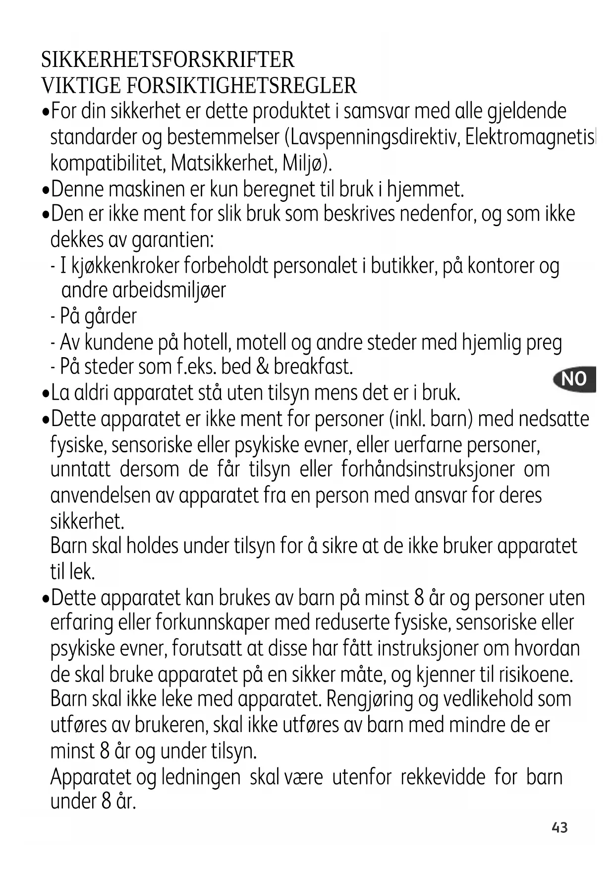 - Dette apparatet kan brukes av barn på minst 8 år og personer uten erfaring eller forkunnskaper med reduserte fysiske, sensoriske eller psykiske evner, forutsatt at disse har fått instruksjoner om hvordan de skal bruke apparatet på en sikker måte, og kjenner til risikoene. Barn skal ikke leke med apparatet. Rengjøring og vedlikehold som utføres av brukeren, skal ikke utføres av barn med mindre de er minst 8 år og under tilsyn. Apparatet og ledningen skal være utenfor rekkevidde for barn under 8 år.