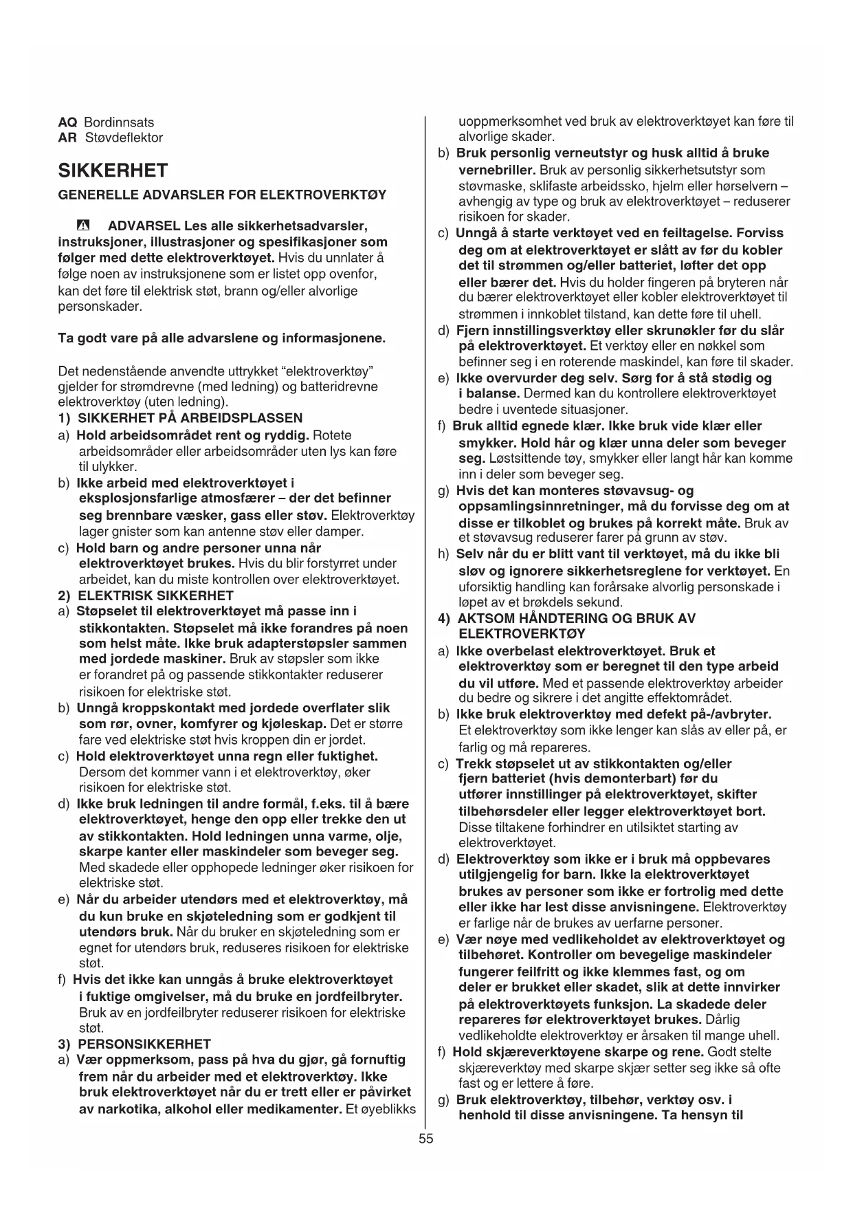 ELEKTROVERKTØY a) Ikke overbelast elektroverktøyet. Bruk et elektroverktøy som er beregnet til den type arbeid du vil utføre. Med et passende elektroverktøy arbeider du bedre og sikrere i det angitte eektområdet. b) Ikke bruk elektroverktøy med defekt på-/avbryter. Et elektroverktøy som ikke lenger kan slås av eller på, er farlig og må repareres. c) Trekk støpselet ut av stikkontakten og/eller fjern batteriet (hvis demonterbart) før du utfører innstillinger på elektroverktøyet, skifter tilbehørsdeler eller legger elektroverktøyet bort. Disse tiltakene forhindrer en utilsiktet starting av elektroverktøyet. d) Elektroverktøy som ikke er i bruk må oppbevares utilgjengelig for barn. Ikke la elektroverktøyet brukes av personer som ikke er fortrolig med dette eller ikke har lest disse anvisningene. Elektroverktøy er farlige når de brukes av uerfarne personer. e) Vær nøye med vedlikeholdet av elektroverktøyet og tilbehøret. Kontroller om bevegelige maskindeler fungerer feilfritt og ikke klemmes fast, og om deler er brukket eller skadet, slik at dette innvirker på elektroverktøyets funksjon. La skadede deler repareres før elektroverktøyet brukes. Dårlig vedlikeholdte elektroverktøy er årsaken til mange uhell. f) Hold skjæreverktøyene skarpe og rene. Godt stelte skjæreverktøy med skarpe skjær setter seg ikke så ofte fast og er lettere å føre. g) Bruk elektroverktøy, tilbehør, verktøy osv. i henhold til disse anvisningene. Ta hensyn til AQ Bordinnsats AR Støvdeektor SIKKERHET