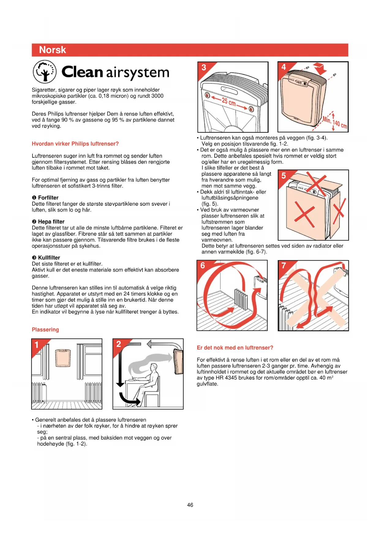 45• Luftrenseren kan også monteres på veggen (fig. 3-4). Velg en posisjon tilsvarende fig. 1-2.• Det er også mulig å plassere mer enn en luftrenser i sammerom. Dette anbefales spesielt hvis rommet er veldig stortog/eller har en uregelmessig form.I slike tilfeller er det best åplassere apparatene så langtfra hverandre som mulig,men mot samme vegg.• Dekk aldri til luftinntak- ellerluftutblåsingsåpningene (fig. 5).• Ved bruk av varmeovnerplasser luftrenseren slik atluftstrømmen somluftrenseren lager blanderseg med luften fravarmeovnen.Dette betyr at luftrenseren settes ved siden av radiator ellerannen varmekilde (fig. 6-7).Er det nok med en luftrenser?For effektivt å rense luften i et rom eller en del av et rom måluften passere luftrenseren 2-3 ganger pr. time. Avhengig avluftinnholdet i rommet og det aktuelle området bør en luftrenserav type HR 4345 brukes for rom/områder opptil ca. 40 m gulvflate.Sigaretter, sigarer og piper lager røyk som inneholdermikroskopiske partikler (ca. 0,18 micron) og rundt 3000forskjellige gasser.Deres Philips luftrenser hjelper Dem å rense luften effektivt,ved å fange 90 % av gassene og 95 % av partiklene dannetved røyking.Hvordan virker Philips luftrenser?Luftrenseren suger inn luft fra rommet og sender luftengjennom filtersystemet. Etter rensing blåses den rengjorteluften tilbake i rommet mot taket.For optimal fjerning av gass og partikler fra luften benytterluftrenseren et sofistikert 3-trinns filter.❶ ForfilterDette filteret fanger de største støvpartiklene som svever iluften, slik som lo og hår.❷ Hepa filterDette filteret tar ut alle de minste luftbårne partiklene. Filteret erlaget av glassfiber. Fibrene står så tett sammen at partiklerikke kan passere gjennom. Tilsvarende filtre brukes i de flesteoperasjonsstuer på sykehus.❸ KullfilterDet siste filteret er et kullfilter.Aktivt kull er det eneste materiale som effektivt kan absorberegasser.Denne luftrenseren kan stilles inn til automatisk å velge riktighastighet. Apparatet er utstyrt med en 24 timers klokke og entimer som gjør det mulig å stille inn en brukertid. Når dennetiden har utløpt vil apparatet slå seg av.En indikator vil begynne å lyse når kullfilteret trenger å byttes. Plassering• Generelt anbefales det å plassere luftrenseren- i nærheten av der folk røyker, for å hindre at røyken sprer seg; - på en sentral plass, med baksiden mot veggen og overhodehøyde (fig. 1-2). Norsk